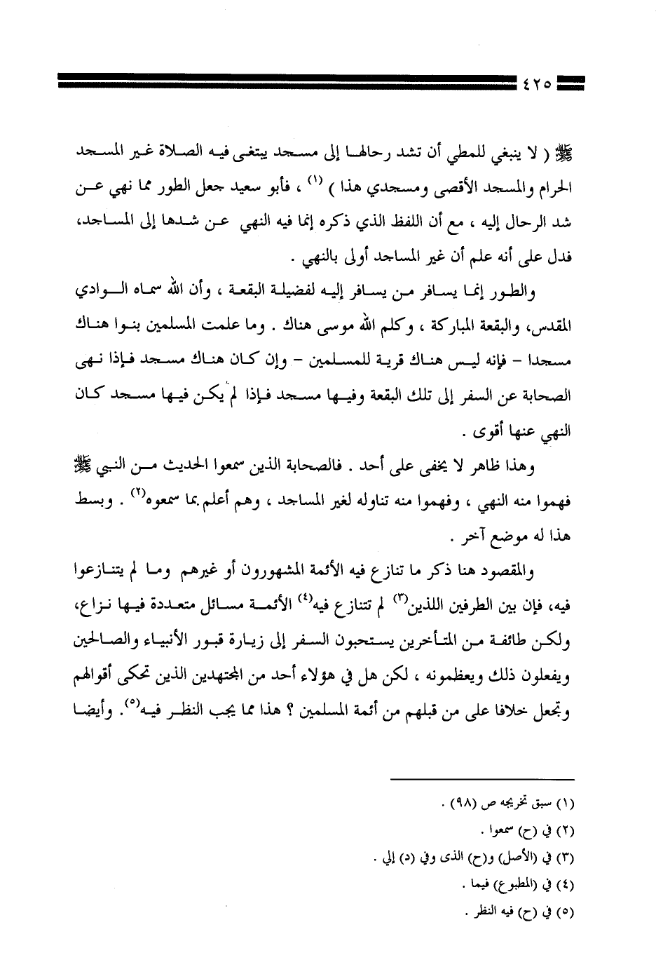 صلى الله عليه وسلم (لا ينبغي للمطي أن تشد رحالها إلى مسجد يبتغى فيه الصلاة غير المسجد الحرام والمسجد الأقصى ومسجدي هذا)، فأبو سعيد جعل الطور مما نهي عن شد الرحال إليه، مع أن اللفظ الذي ذكره إنما فيه النهي عن شدها إلى المساجد، فدل على أنه علم أن غير المساجد أولى بالنهي.