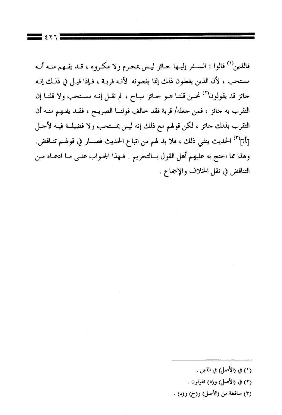 فالذين قالوا: السفر إليها جائز ليس بمحرم ولا مكروه، قد يفهم منه أنه مستحب، لأن الذين يفعلون ذلك إنما يفعلونه لأنه قربة، فإذا قيل في ذلك إنه جائز قد يقولون نحن قلنا هو جائز مباح، لم نقل إنه مستحب ولا قلنا إن التقرب به جائز، فمن جعله / قربة فقد خالف قولنا الصريح، فقد يفهم منه أن التقرب به جائز، لكن قولهم مع ذلك إنه ليس بمستحب ولا فضيلة فيه لأجل [أن] الحديث ينفي ذلك، فلا بد لهم من اتباع الحديث فصار في قولهم تناقض. وهذا مما احتج به عليهم أهل القول بالتحريم. فهذا الجواب على ما ادعاه من التناقض في نقل الخلاف والإجماع.