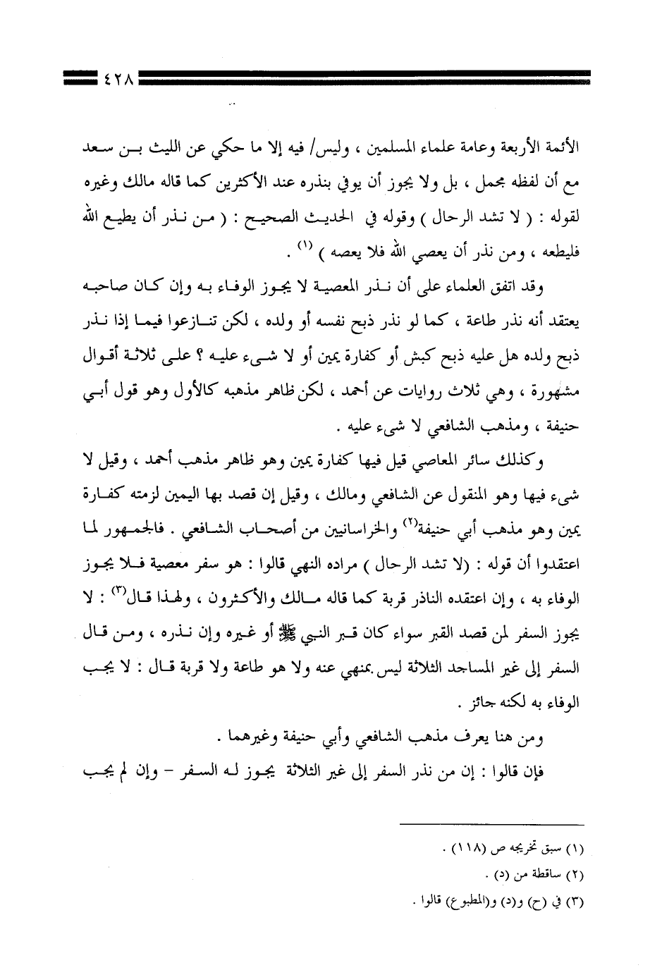 وكذلك سائر المعاصي قيل فيها كفارة يمين وهو ظاهر مذهب أحمد، وقيل لا شيء فيها وهو المنقول عن الشافعي ومالك، وقيل إن قصد بها اليمين لزمته كفارة يمين وهو مذهب أبي حنيفة والخراسانيين من أصحاب الشافعي. فالجمهور لما اعتقدوا أن قوله: (لا تشد الرحال) مراده النهي قالوا: هو سفر معصية فلا يجوز الوفاء به، وإن اعتقده الناذر قربة كما قاله مالك والأكثرون، ولهذا قال: لا يجوز السفر لمن قصد القبر سواء كان قبر النبي صلى الله عليه وسلم أو غيره وإن نذره، ومن قال السفر إلى غير المساجد الثلاثة ليس بمنهي عنه ولا طاعة ولا قربة قال: لا يجب الوفاء به لكنه جائز.