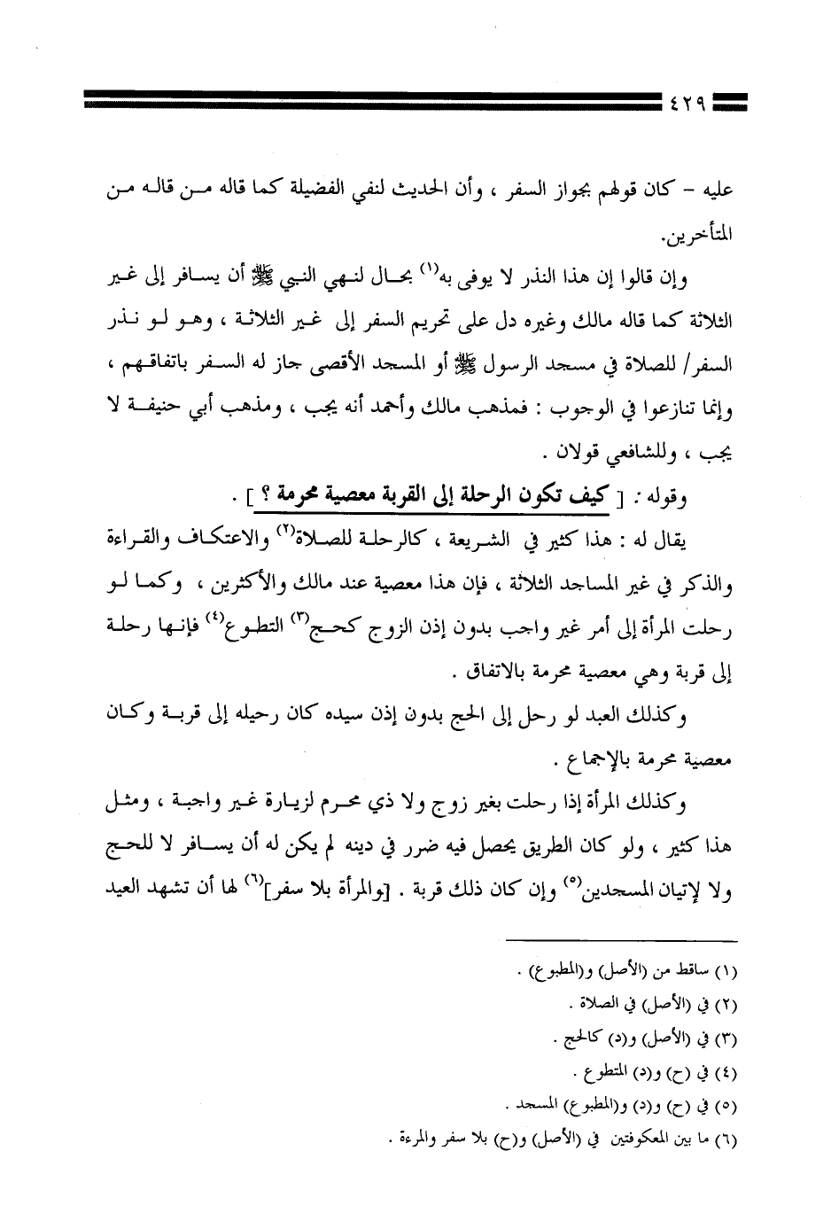 يقال له: هذا كثير في الشريعة، كالرحلة للصلاة والاعتكاف والقراءة والذكر في غير المساجد الثلاثة، فإن هذا معصية عند مالك والأكثرين، وكما لو رحلت المرأة إلى أمر غير واجب بدون إذن الزوج كحج التطوع فإنها رحلة إلى قربة وهي معصية محرمة بالاتفاق.