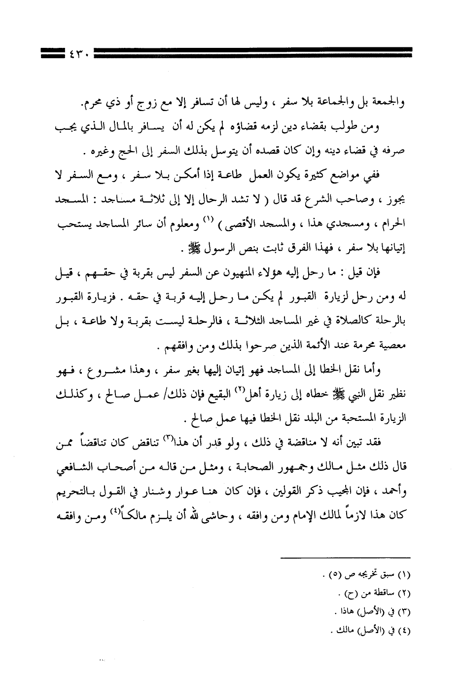 فإن قيل: ما رحل إليه هؤلاء المنهيون عن السفر ليس بقربة في حقهم، قيل له ومن رحل لزيارة القبور لم يكن ما رحل إليه قربة في حقه. فزيارة القبور بالرحلة كالصلاة في غير المساجد الثلاثة، فالرحلة ليست بقربة ولا طاعة، بل معصية محرمة عند الأئمة الذين صرحوا بذلك ومن وافقهم.