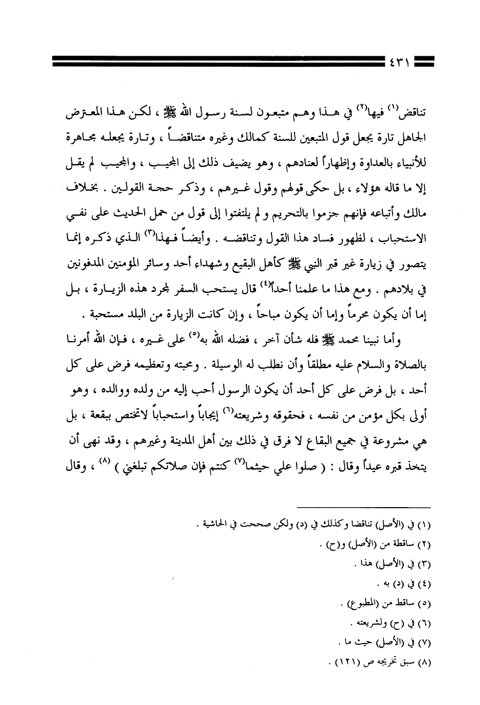تناقض فيها في هذا وهم متبعون لسنة رسول الله صلى الله عليه وسلم، لكن هذا المعترض الجاهل تارة يجعل قول المتبعين للسنة كمالك وغيره متناقضًا، وتارة يجعله مجاهرة للأنبياء بالعداوة وإظهارًا لعنادهم، وهو يضيف ذلك إلى المجيب، والمجيب لم يقل إلا ما قاله هؤلاء، بل حكى قولهم وقول غيرهم، وذكر حجة القولين. بخلاف مالك وأتباعه فإنهم جزموا بالتحريم ولم يلتفتوا إلى قول من حمل الحديث على نفي الاستحباب، لظهور فساد هذا القول وتناقضه. وأيضًا فهذا الذي ذكره إنما يتصور في زيارة غير قبر النبي صلى الله عليه وسلم كأهل البقيع وشهداء أحد وسائر المؤمنين المدفونين في بلادهم. ومع هذا ما علمنا أحدًا قال يستحب السفر لمجرد هذه الزيارة، بل إما أن يكون محرمًا وإما أن يكون مباحًا، وإن كانت الزيارة من البلد مستحبة.