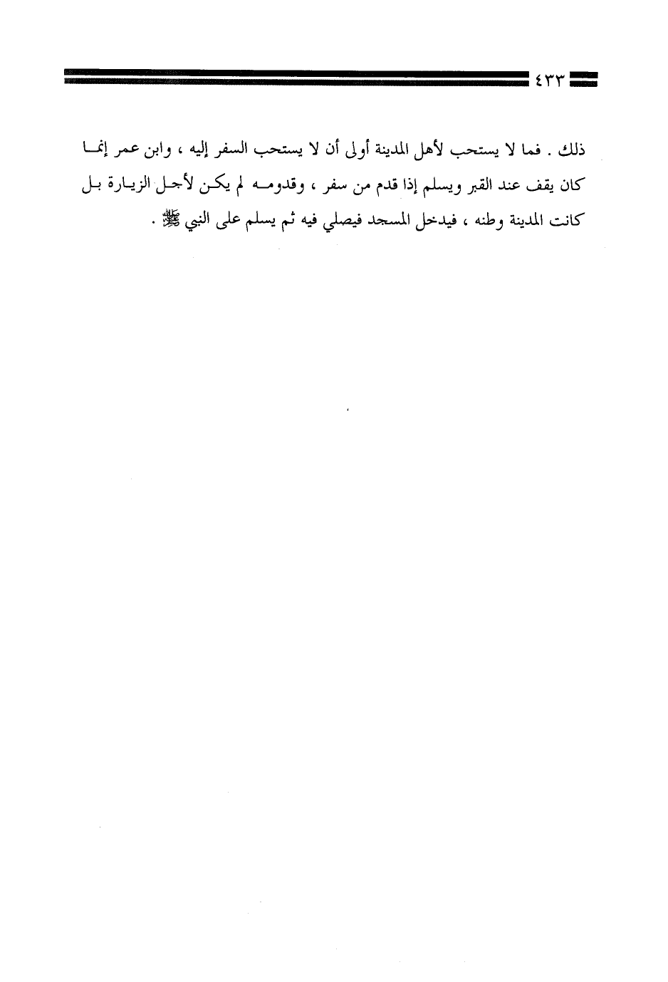 ذلك. فما لا يستحب لأهل المدينة أولى أن لا يستحب السفر إليه، وابن عمر إنما كان يقف عند القبر ويسلم إذا قدم من سفر، وقدومه لم يكن لأجل الزيارة بل كانت المدينة وطنه، فيدخل المسجد فيصلي فيه ثم يسلم على النبي صلى الله عليه وسلم.