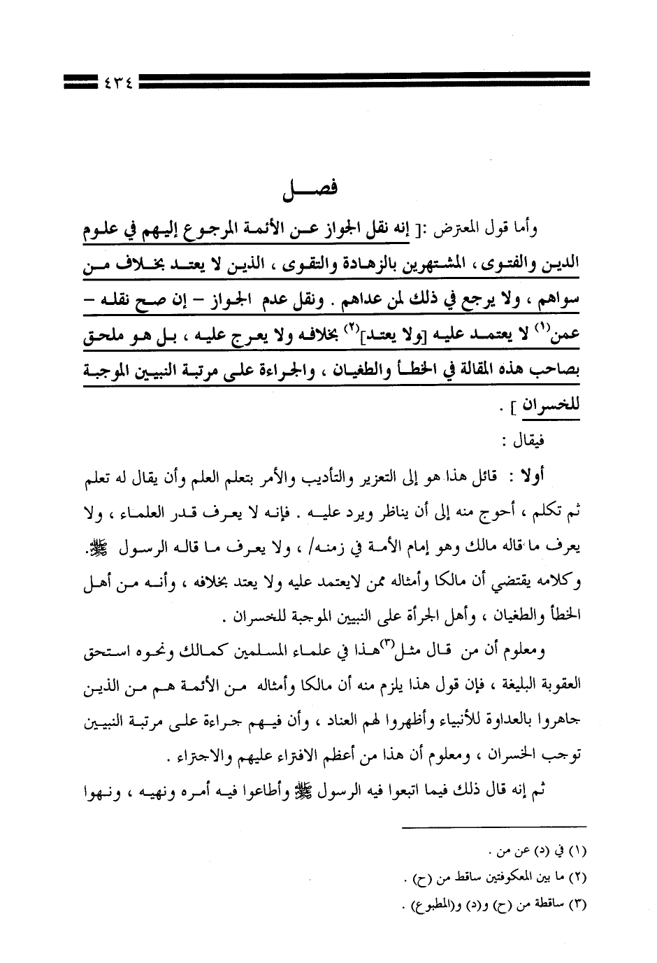 ومعلوم أن من قال مثل هذا في علماء المسلمين كمالك ونحوه استحق العقوبة البليغة، فإن قول هذا يلزم منه أن مالكًا وأمثاله من الأئمة هم من الذين جاهروا بالعداوة للأنبياء وأظهروا لهم العناد، وأن فيهم جراءة على مرتبة النبيين توجب الخسران، ومعلوم أن هذا من أعظم الافتراء عليهم والاجتراء.
