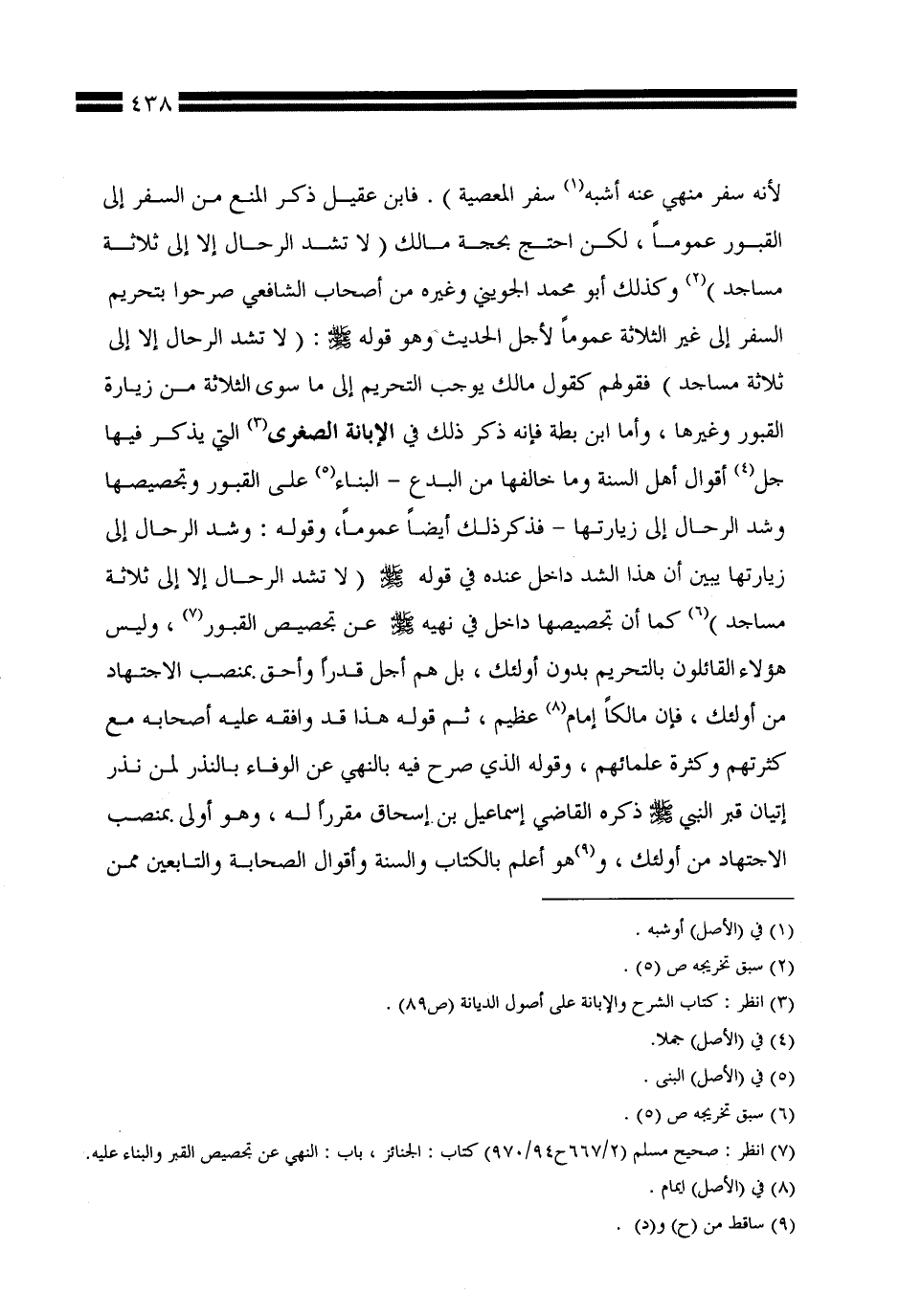 لأنه سفر منهي عنه أشبه سفر المعصية). فابن عقيل ذكر المنع من السفر إلى القبور عمومًا، لكن احتج بحجة مالك (لا تشد الرحال إلا إلى ثلاثة مساجد) وكذلك أبو محمد الجويني وغيره من أصحاب الشافعي صرحوا بتحريم السفر إلى غير الثلاثة عمومًا لأجل الحديث وهو قوله صلى لله عليه وسلم: (لا تشد الرحال إلا إلى ثلاثة مساجد) فقولهم كقول مالك يوجب التحريم إلى ما سوى الثلاثة من زيارة القبور وغيرها، وأما ابن بطة فإنه ذكر ذلك في الإبانة الصغرى التي يذكر فيها جل أقوال أهل السنة وما خالفها من البدع -البناء على القبور وتجصيصها وشد الرحال إلى زيارتها- فذكر ذلك أيضًا عمومًا، وقوله: وشد الرحال إلى زيارتها يبين أن هذا الشد داخل عنده في قوله صلى الله عليه وسلم (لا تشد الرحال إلا إلى ثلاثة مساجد) كما أن تجصيصها داخل في نهيه صلى الله عليه وسلم عن تجصيص القبور، وليس هؤلاء القائلون بالتحريم بدون أولئك، بل هم أجل قدرًا وأحق بمنصب الاجتهاد من أولئك، فإن مالكًا إمام عظيم، ثم قوله هذا قد وافقه عليه أصحابه مع كثرتهم وكثرة علمائهم، وقوله الذي صرح فيه بالنهي عن الوفاء بالنذر لمن نذر إتيان قبر النبي صلى الله عليه وسلم ذكره القاضي إسماعيل بن إسحاق مقررًا له، وهو أولى بمنصب الاجتهاد من أولئك، وهو أعلم بالكتاب والسنة وأقوال الصحابة والتابعين ممن