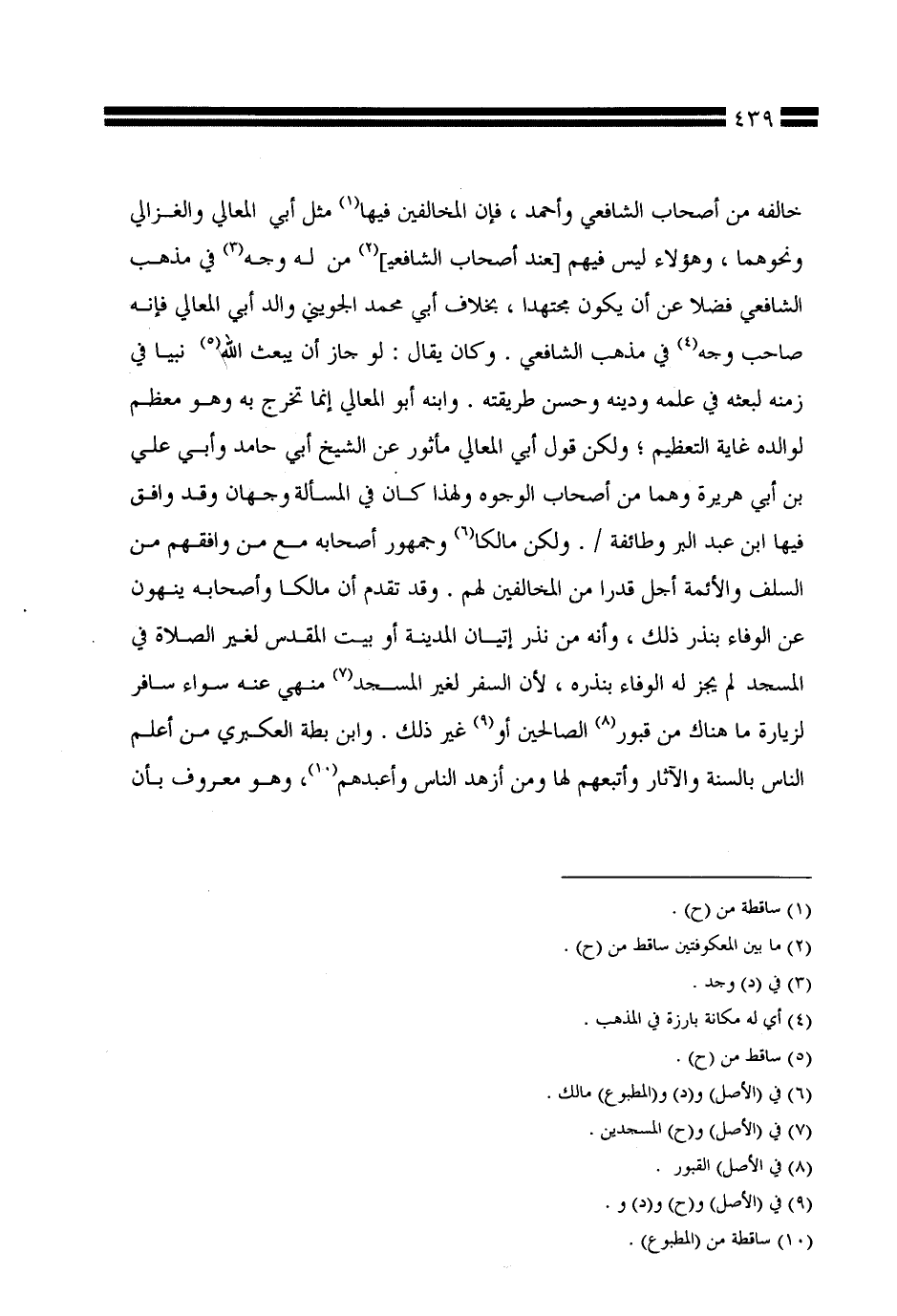 خالفه من أصحاب الشافعي وأحمد، فإن المخالفين فيها مثل أبي المعالي والغزالي ونحوهما، وهؤلاء ليس فيهم [عند أصحاب الشافعي] من له وجه في مذهب الشافعي فضلاً عن أن يكون مجتهدًا، بخلاف أبي محمد الجويني والد أبي المعالي فإنه صاحب وجه في مذهب الشافعي. وكان يقال: لو جاز أن يبعث الله نبيًّا في زمنه لبعثه في علمه ودينه وحسن طريقته. وابنه أبو المعالي إنما تخرج به وهو معظم لوالده غاية التعظيم؛ ولكن قول أبي المعالي مأثور عن الشيخ أبي حامد وأبي علي بن أبي هريرة وهما من أصحاب الوجوه ولهذا كان في المسألة وجهان وقد وافق فيها ابن عبد البر وطائفة. / ولكن مالكًا وجمهور أصحابه مع من وافقهم من السلف والأئمة أجل قدرًا من المخالفين لهم. وقد تقدم أن مالكًا وأصحابه ينهون عن الوفاء بنذر ذلك، وأنه من نذر إتيان المدينة أو بيت المقدس لغير الصلاة في المسجد لم يجز له الوفاء بنذره، لأن السفر لغير المسجد منهي عنه سواء سافر لزيارة ما هناك من قبور الصالحين أو غير ذلك. وابن بطة العكبري من أعلم الناس بالسنة والآثار وأتبعهم لها ومن أزهد الناس وأعبدهم، وهو معروف بأن