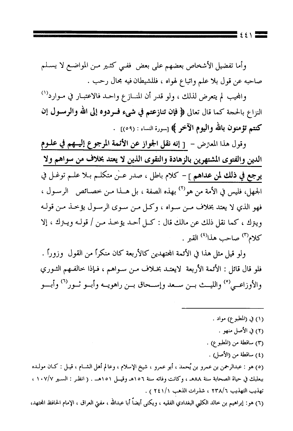 ولو قيل مثل هذا في الأئمة المجتهدين كالأربعة كان منكرًا من القول وزورًا. فلو قال قائل: الأئمة الأربعة لا يعتد بخلاف من سواهم، فإذا خالفهم الثوري والأوزاعي والليث بن سعد وإسحاق بن راهويه وأبو ثور وأبو