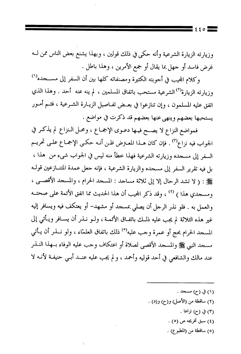 فمواضع النزاع لا يصح فيها دعوى الإجماع، ومحل النزاع لم يذكر في الجواب فيه نزاع. فإن كان هذا المعترض ظن أنه حكى الإجماع على تحريم السفر إلى مسجده وزيارته الشرعية فهذا خطأ منه ليس في الجواب شيء من هذا، بل فيه تقرير السفر إلى مسجده والزيارة الشرعية، فإنه جعل عمدة المتنازعين قوله صلى الله عليه وسلم: (لا تشد الرحال إلا إلى ثلاثة مساجد: المسجد الحرام، والمسجد الأقصى، ومسجدي هذا)، وقد ذكر المجيب أن هذا الحديث مما اتفق الأئمة على صحته والعمل به. فلو نذر الرجل أن يصلي بمسجد أو مشهد - أو يعتكف فيه ويسافر إليه غير هذه الثلاثة لم يجب عليه ذلك باتفاق الأئمة، ولو نذر أن يسافر ويأتي إلى المسجد الحرام بحج أو عمرة وجب عليه ذلك باتفاق العلماء، ولو نذر أن يأتي مسجد النبي صلى الله عليه وسلم والمسجد الأقصى لصلاة أو اعتكاف وجب عليه الوفاء بهذا النذر عند مالك والشافعي في أحد قوليه وأحمد، ولم يجب عليه عند أبي حنيفة لأنه لا