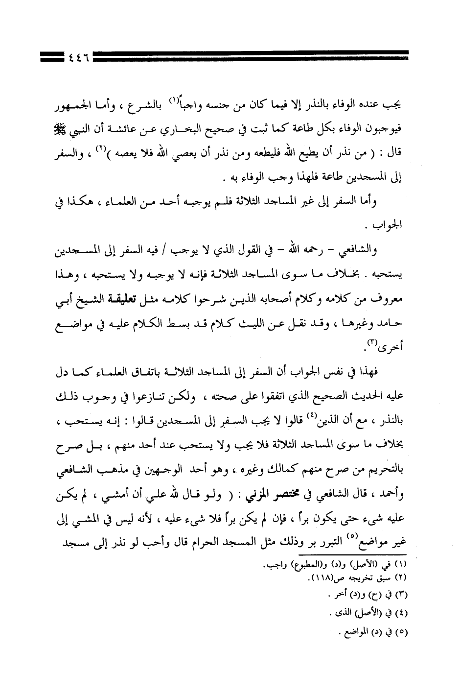 فهذا في نفس الجواب أن السفر إلى المساجد الثلاثة باتفاق العلماء كما دل عليه الحديث الصحيح الذي اتفقوا على صحته، ولكن تنازعوا في وجوب ذلك بالنذر، مع أن الذين قالوا لا يجب السفر إلى المسجدين قالوا: إنه يستحب، بخلاف ما سوى المساجد الثلاثة فلا يجب ولا يستحب عند أحد منهم، بل صرح بالتحريم من صرح منهم كمالك وغيره، وهو أحد الوجهين في مذهب الشافعي وأحمد، قال الشافعي في مختصر المزني: (ولو قال لله علي أن أمشي، لم يكن عليه شيء حتى يكون برًّا، فإن لم يكن برًّا فلا شيء عليه، لأنه ليس في المشي إلى غير مواضع التبرر بر وذلك مثل المسجد الحرام قال وأحب لو نذر إلى مسجد