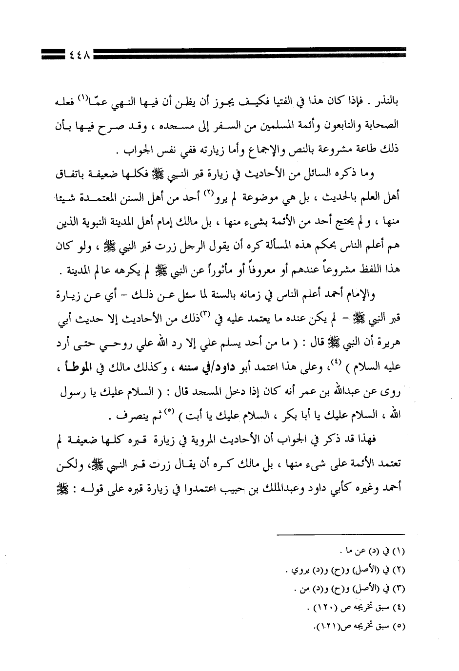 فهذا قد ذكر في الجواب أن الأحاديث المروية في زيارة قبره كلها ضعيفة لم تعتمد الأئمة على شيء منها، بل مالك كره أن يقال زرت قبر النبي صلى الله عليه وسلم، ولكن أحمد وغيره كأبي داود وعبد الملك بن حبيب اعتمدوا في زيارة قبره على قوله صلى الله عليه وسلم: