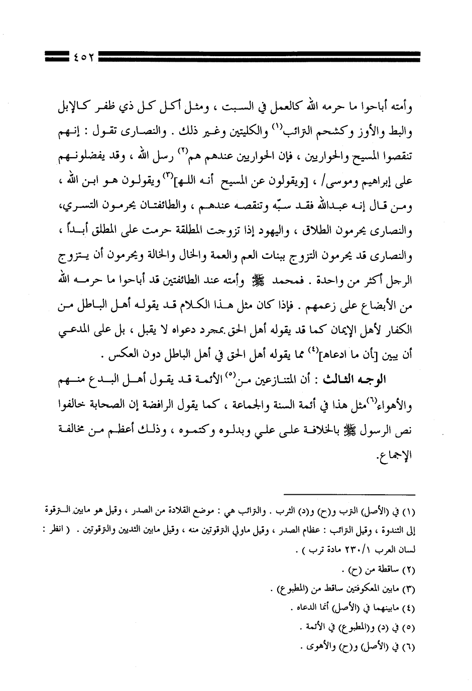 وأمته أباحوا ما حرمه الله كالعمل في السبت، ومثل أكل كل ذي ظفر كالإبل والبط والإوز وكشحم الترائب والكليتين وغير ذلك، والنصارى تقول: إنهم تنقصوا المسيح والحواريين، فإن الحواريين عندهم هم رسل الله، وقد يفضلونهم على إبراهيم وموسى، / [ويقولون عن المسيح أنه الله] ويقولون هو ابن الله، ومن قال إنه عبد الله فقد سبّه وتنقصه عندهم، والطائفتان يحرمون التسري، والنصارى يحرمون الطلاق، واليهود إذا تزوجت المطلقة حرمت على المطلق أبدًا، والنصارى قد يحرمون التزوج ببنات العم والعمة والخال والخالة ويحرمون أن يتزوج الرجل أكثر من واحدة. فمحمد صلى الله عليه وسلم وأمته عند الطائفتين قد أباحوا ما حرمه الله من الأبضاع على زعمهم. فإذا كان مثل هذا الكلام قد يقوله أهل الباطل من الكفار لأهل الإيمان كما قد يقوله أهل الحق بمجرد دعواه لا يقبل، بل على المدعي أن يبين [أن ما ادعاه] مما يقوله أهل الحق في أهل الباطل دون العكس.