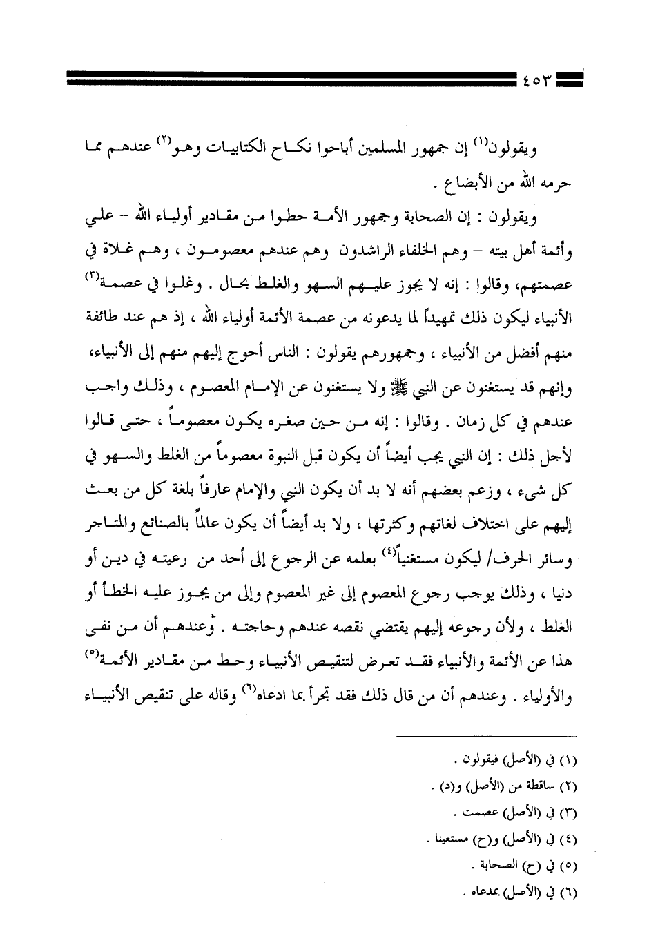 ويقولون: إن الصحابة وجمهور الأمة حطوا من مقادير أولياء الله -علي وأئمة أهل بيته- وهم الخلفاء الراشدون وهم عندهم معصومون، وهم غلاة في عصمتهم، وقالوا: إنه لا يجوز عليهم السهو والغلط بحال. وغلوا في عصمة الأنبياء ليكون ذلك تمهيدًا لما يدعونه من عصمة الأئمة أولياء الله، إذ هم عند طائفة منهم أفضل من الأنبياء، وجمهورهم يقولون: الناس أحوج إليهم منهم إلى الأنبياء، وإنهم قد يستغنون عن النبي صلى الله عليه وسلم ولا يستغنون عن الإمام المعصوم، وذلك واجب عندهم في كل زمان. وقالوا: إنه من حين صغره يكون معصومًا، حتى قالوا لأجل ذلك: إن النبي يجب أيضًا أن يكون قبل النبوة معصومًا من الغلط والسهو في كل شيء، وزعم بعضهم أنه لا بد أن يكون النبي والإمام عارفًا بلغة كل من بعث إليهم على اختلاف لغاتهم وكثرتها، ولا بد أيضًا أن يكون عالمًا بالصنائع والمتاجر وسائر الحرف / ليكون مستغنيًا بعلمه عن الرجوع إلى أحد من رعيته في دين أو دنيا، وذلك يوجب رجوع المعصوم إلى غير المعصوم وإلى من يجوز عليه الخطأ أو الغلط، ولأن رجوعه إليهم يقتضي نقصه عندهم وحاجته. وعندهم أن من نفى هذا عن الأئمة والأنبياء فقد تعرض لتنقيص الأنبياء وحط من مقادير الأئمة والأولياء. وعندهم أن من قال ذلك فقد تجرأ بما ادعاه وقاله على تنقيص الأنبياء
