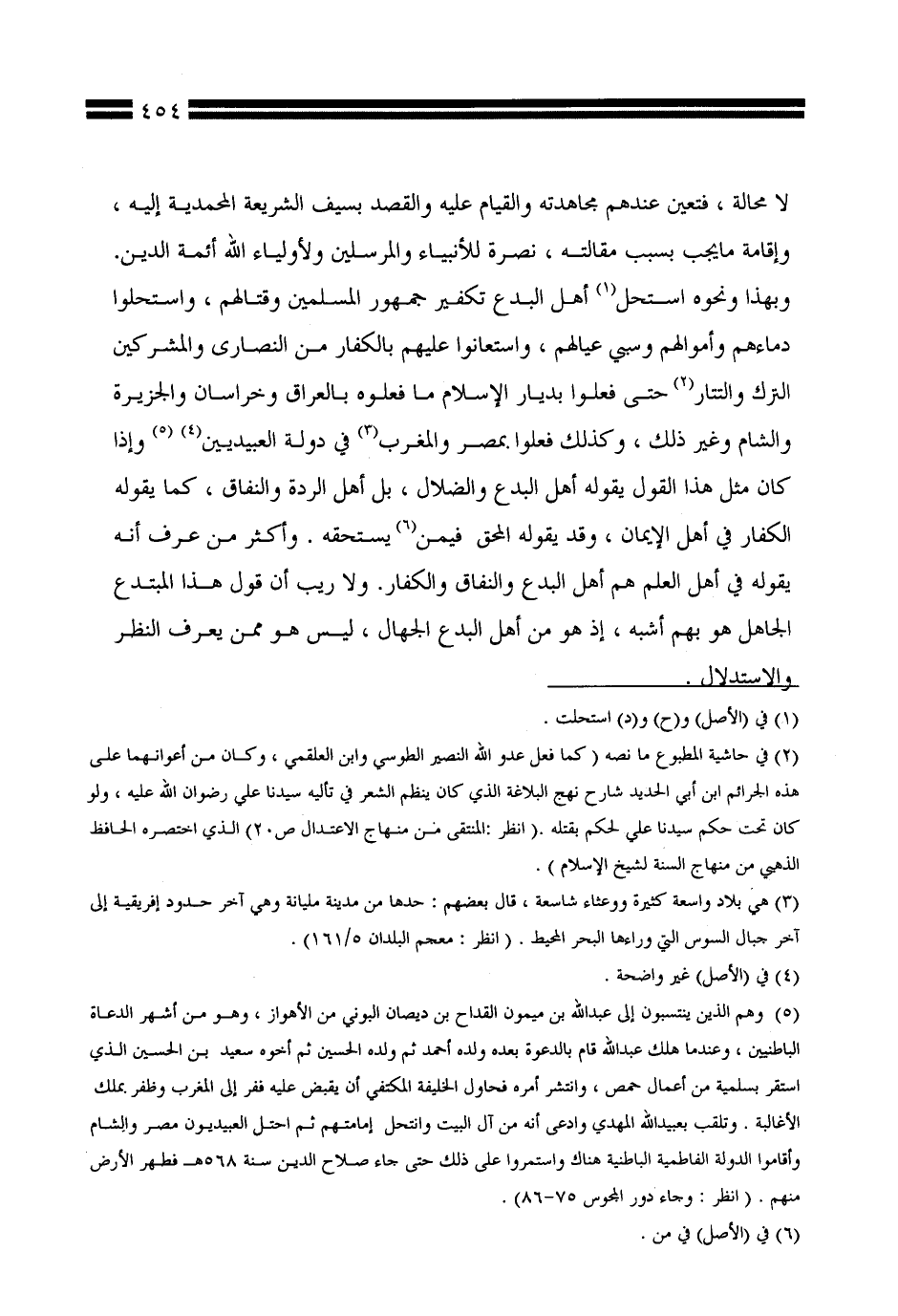 لا محالة، فتعين عندهم مجاهدته والقيام عليه والقصد بسيف الشريعة المحمدية إليه، وإقامة ما يجب بسبب مقالته، نصرة للأنبياء والمرسلين ولأولياء الله أئمة الدين. وبهذا ونحوه استحل أهل البدع تكفير جمهور المسلمين وقتالهم، واستحلوا دماءهم وأموالهم وسبي عيالهم، واستعانوا عليهم بالكفار من النصارى والمشركين الترك والتتار حتى فعلوا بديار الإسلام ما فعلوه بالعراق وخراسان والجزيرة والشام وغير ذلك، وكذلك فعلوا بمصر والمغرب في دولة العبيديين. وإذا كان مثل هذا القول يقوله أهل البدع والضلال، بل أهل الردة والنفاق، كما يقوله الكفار في أهل الإيمان، وقد يقوله المحق فيمن يستحقه. وأكثر من عرف أنه يقوله في أهل العلم هم أهل البدع والنفاق والكفار. ولا ريب أن قول هذا المبتدع الجاهل هو بهم أشبه، إذ هو من أهل البدع الجهال، ليس هو ممن يعرف النظر والاستدلال.