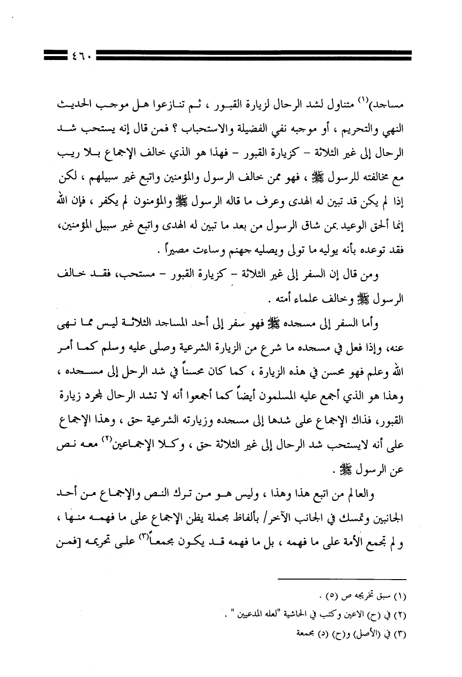 وأما السفر إلى مسجده صلى الله عليه وسلم فهو سفر إلى أحد المساجد الثلاثة ليس مما نهى عنه، وإذا فعل في مسجده ما شرع من الزيارة الشرعية وصلى عليه وسلم كما أمر الله وعلم فهو محسن في هذه الزيارة، كما كان محسنًا في شد الرحل إلى مسجده، وهذا هو الذي أجمع عليه المسلمون أيضًا كما أجمعوا أنه لا تشد الرحال لمجرد زيارة القبور، فذاك الإجماع على شدها إلى مسجده وزيارته الشرعية حق، وهذا الإجماع على أنه لا يستحب شد الرحال إلى غير الثلاثة حق، وكلا الإجماعين معه نص عن الرسول صلى الله عليه وسلم.