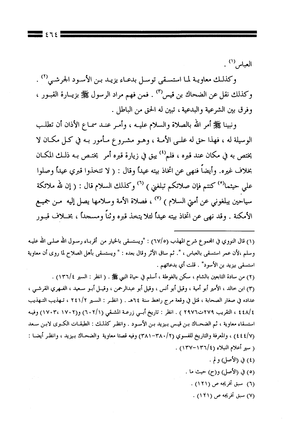 وكذلك معاوية لما استسقى توسل بدعاء يزيد بن الأسود الجرشي. وكذلك نقل عن الضحاك بن قيس. فمن فهم مراد الرسول صلى الله عليه وسلم بزيارة القبور، وفرق بين الشرعية والبدعية، تبين له الحق من الباطل.