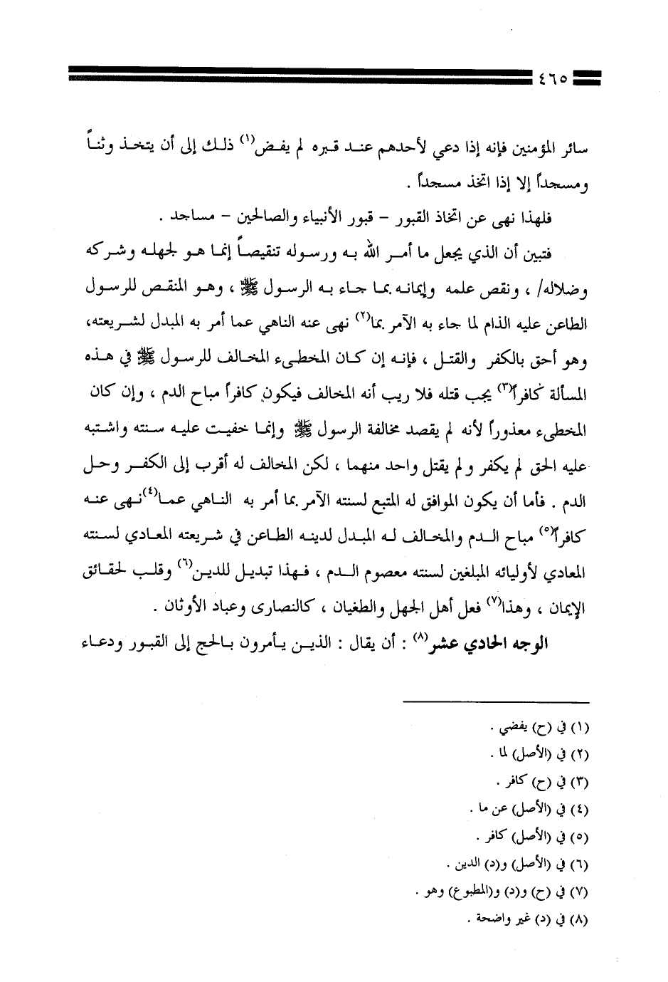 فتبين أن الذي يجعل ما أمر الله به ورسوله تنقيصًا إنما هو لجهله وشركه وضلاله، / ونقص علمه وإيمانه بما جاء به الرسول صلى الله عليه وسلم، وهو المنقص للرسول الطاعن عليه الذام لما جاء به الآمر بما نهى عنه الناهي عما أمر به المبدل لشريعته، وهو أحق بالكفر والقتل، فإنه إن كان المخطئ المخالف للرسول صلى الله عليه وسلم في هذه المسألة كافرًا يجب قتله فلا ريب أنه المخالف فيكون كافرًا مباح الدم، وإن كان المخطئ معذورًا لأنه لم يقصد مخالفة الرسول صلى الله عليه وسلم وإنما خفيت عليه سنته واشتبه عليه الحق لم يكفر ولم يقتل واحد منهما، لكن المخالف له أقرب إلى الكفر وحل الدم. فأما أن يكون الموافق له المتبع لسنته الآمر بما أمر به الناهي عما نهى عنه كافرًا مباح الدم والمخالف له المبدل لدينه الطاعن في شريعته المعادي لسنته المعادي لأوليائه المبلغين لسنته معصوم الدم، فهذا تبديل للدين وقلب لحقائق الإيمان، وهذا فعل أهل الجهل والطغيان، كالنصارى وعباد الأوثان.