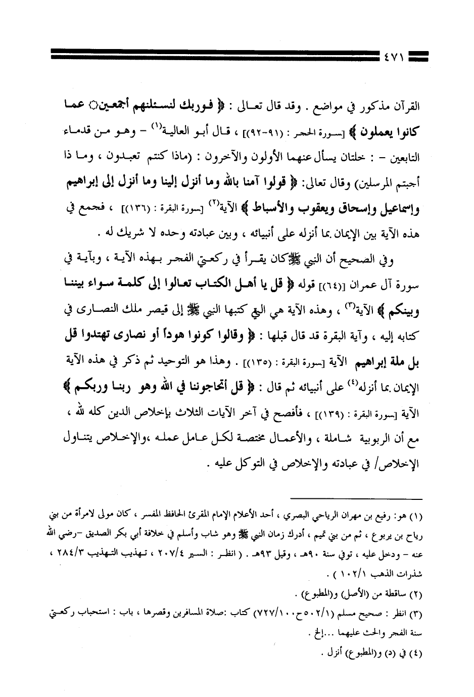 وفي الصحيح أن النبي صلى الله عليه وسلم كان يقرأ في ركعتي الفجر بهذه الآية، وبآية في سورة آل عمران [(64)] قوله {قل يا أهل الكتاب تعالوا إلى كلمة سواء بيننا وبينكم} الآية، وهذه الآية هي التي كتبها النبي صلى الله عليه وسلم إلى قيصر ملك النصارى في كتابه إليه، وآية البقرة قد قال قبلها: {وقالوا كونوا هودًا أو نصارى تهتدوا قل بل ملة إبراهيم} الآية [سورة البقرة: (135)]. وهذا هو التوحيد ثم ذكر في هذه الآية الإيمان بما أنزله على أنبيائه ثم قال: {قل أتحاجوننا في الله وهو ربنا وربكم} الآية [سورة البقرة: (139)]، فأفصح في آخر الآيات الثلاث بإخلاص الدين كله لله، مع أن الربوبية شاملة، والأعمال مختصة لكل عامل عمله، والإخلاص يتناول الإخلاص / في عبادته والإخلاص في التوكل عليه.