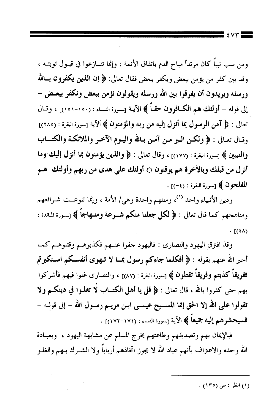 ومن سب نبيًّا كان مرتدًّا مباح الدم باتفاق الأئمة، وإنما تنازعوا في قبول توبته، وقد بين كفر من يؤمن ببعض ويكفر ببعض فقال تعالى: {إن الذين يكفرون بالله ورسله ويريدون أن يفرقوا بين الله ورسله ويقولون نؤمن ببعض ونكفر ببعض -إلى قوله- أولئك هم الكافرون حقًّا} الآية [سورة النساء: (150 - 151)]، وقال تعالى: {آمن الرسول بما أنزل إليه من ربه والمؤمنون} الآية [سورة البقرة: (285)]، وقال تعالى: {ولكن البر من آمن بالله واليوم الآخر والملائكة والكتاب والنبيين} [سورة البقرة: (177)]، وقال تعالى: {والذين يؤمنون بما أنزل إليك وما أنزل من قبلك وبالآخرة هم يوقنون * أولئك على هدى من ربهم وأولئك هم المفلحون} [سورة البقرة: (4 - 5)].