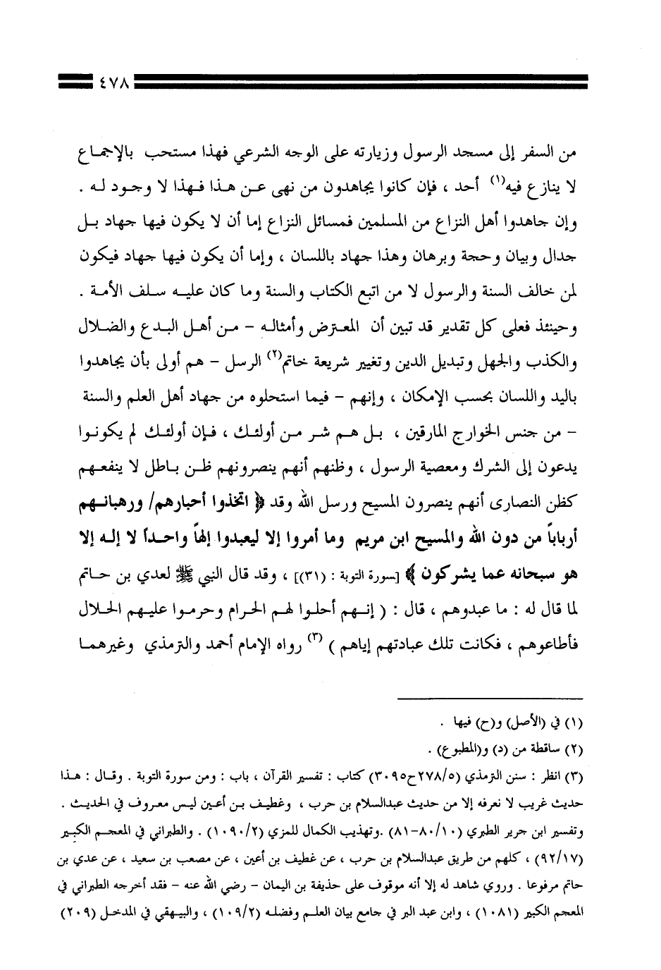 من السفر إلى مسجد الرسول وزيارته على الوجه الشرعي فهذا مستحب بالإجماع لا ينازع فيه أحد، فإن كانوا يجاهدون من نهى عن هذا فهذا لا وجود له. وإن جاهدوا أهل النزاع من المسلمين فمسائل النزاع إما أن لا يكون فيها جهاد بل جدال وبيان وحجة وبرهان وهذا جهاد باللسان، وإما أن يكون فيها جهاد فيكون لمن خالف السنة والرسول لا من اتبع الكتاب والسنة وما كان عليه سلف الأمة. وحينئذ فعلى كل تقدير قد تبين أن المعترض وأمثاله -من أهل البدع والضلال والكذب والجهل وتبديل الدين وتغيير شريعة خاتم الرسل- هم أولى بأن يجاهدوا باليد واللسان بحسب الإمكان، وإنهم -فيما استحلوه من جهاد أهل العلم والسنة- من جنس الخوارج المارقين، بل هم شر من أولئك، فإن أولئك لم يكونوا يدعون إلى الشرك ومعصية الرسول، وظنهم أنهم ينصرونهم ظن باطل لا ينفعهم كظن النصارى أنهم ينصرون المسيح ورسل الله وقد {اتخذوا أحبارهم / ورهبانهم أربابًا من دون الله والمسيح ابن مريم وما أمروا إلا ليعبدوا إلهًا واحدًا لا إله إلا هو سبحانه عما يشركون} [سورة التوبة: (31)]، وقد قال النبي صلى الله عليه وسلم لعدي بن حاتم لما قال له: ما عبدوهم، قال: (إنهم أحلوا لهم الحرام وحرموا عليهم الحلال فأطاعوهم، فكانت تلك عبادتهم إياهم) رواه الإمام أحمد والترمذي وغيرهما