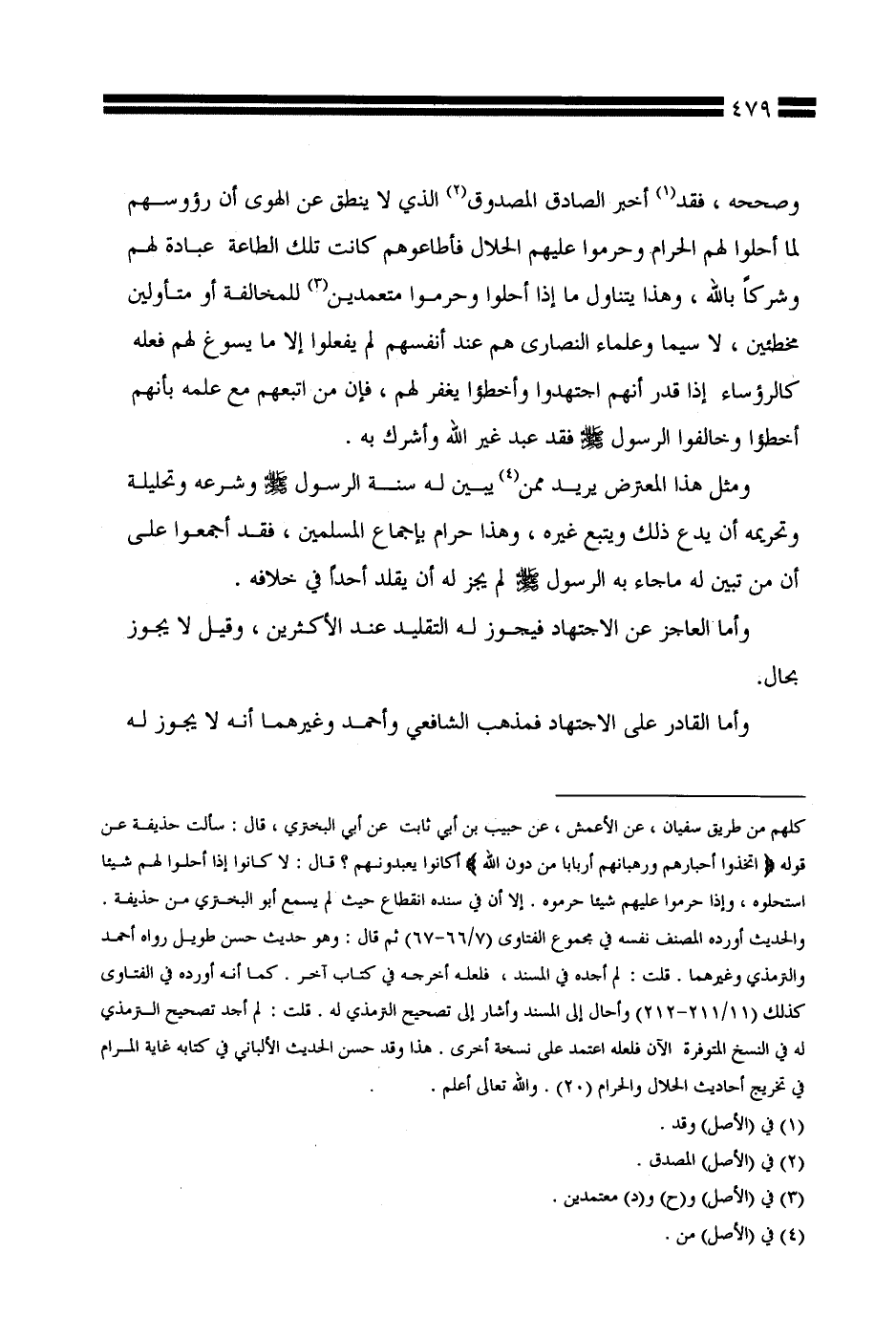 وصححه، فقد أخبر الصادق المصدوق الذي لا ينطق عن الهوى أن رؤوسهم لما أحلوا لهم الحرام وحرموا عليهم الحلال فأطاعوهم كانت تلك الطاعة عبادة لهم وشركًا بالله، وهذا يتناول ما إذا أحلوا وحرموا متعمدين للمخالفة أو متأولين مخطئين، لا سيما وعلماء النصارى هم عند أنفسهم لم يفعلوا إلا ما يسوغ لهم فعله كالرؤساء إذا قدر أنهم اجتهدوا وأخطئوا (¬*) يغفر لهم، فإن من اتبعهم مع علمه بأنهم أخطئوا (¬*) وخالفوا الرسول صلى الله عليه وسلم فقد عبد غير الله وأشرك به.