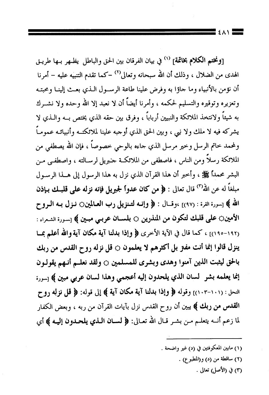 [ونختم الكلام بخاتمة] في بيان الفرقان بين الحق والباطل يظهر بها طريق الهدى من الضلال، وذلك أن الله سبحانه وتعالى -كما تقدم التنبيه عليه- أمرنا أن نؤمن بالأنبياء وما جاءوا (¬*) به وفرض علينا طاعة الرسول الذي بعث إلينا ومحبته وتعزيره وتوقيره والتسليم لحكمه، وأمرنا أيضًا أن لا نعبد إلا الله وحده ولا نشرك به شيئًا ولا نتخذ الملائكة والنبيين أربابًا، وفرق بين حقه الذي يختص به والذي لا يشركه فيه لا ملك ولا نبي، وبين الحق الذي أوجبه علينا لملائكته وأنبيائه عمومًا ولمحمد خاتم الرسل وخير مرسل الذي جاءه بالوحي خصوصًا، فإن الله يصطفي من الملائكة رسلاً ومن الناس، فاصطفى من الملائكة حبريل لرسالته، واصطفى من البشر محمدًا صلى الله عليه وسلم، وأخبر أن هذا القرآن الذي نزل به هذا الرسول إلى هذا الرسول مبلغًا له عن الله قال تعالى: {من كان عدوًّا لجبريل فإنه نزله على قلبك بإذن الله} [سورة البقرة: (97)]، وقال: {وإنه لتنزيل رب العالمين * نزل به الروح الأمين * على قلبك لتكون من المنذرين * بلسان عربي مبين} [سورة الشعراء: (192 - 195)]، كما قال في الآية الأخرى {وإذا بدلنا آية مكان آية والله أعلم بما ينزل قالوا إنما أنت مفتر بل أكثرهم لا يعلمون * قل نزله روح القدس من ربك بالحق ليثبت الذي آمنوا وهدى وبشرى للمسلمين * ولقد نعلم أنهم يقولون إنما يعلمه بشر لسان الذي يلحدون إليه أعجمي وهذا لسان عربي مبين} [سورة النحل: (101 - 103)] وقوله {وإذا بدلنا آية مكان آية} إلى قوله: {قل نزله روح القدس من ربك} يبين أن روح القدس نزل بآيات القرآن من ربه، وبعض الكفار لما زعم أنه يتعلم من بشر قال الله تعالى: {لسان الذي يلحدون إليه} أي