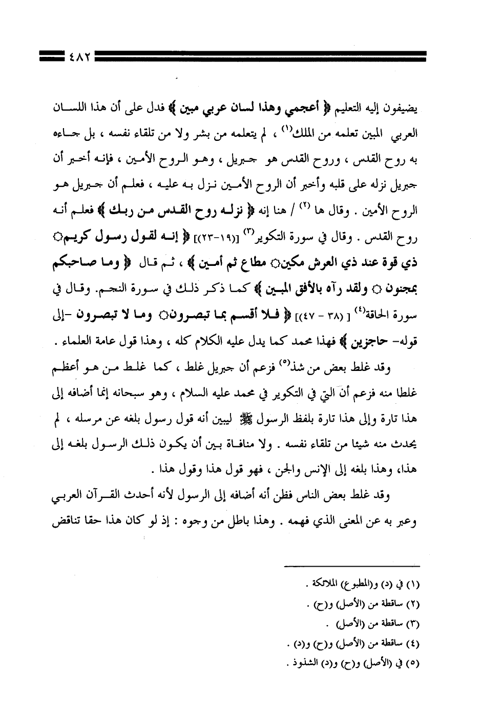 وقد غلط بعض الناس فظن أنه أضافه إلى الرسول لأنه أحدث القرآن العربي وعبر به عن المعنى الذي فهمه. وهذا باطل من وجوه: إذ لو كان هذا حقًّا تناقض
