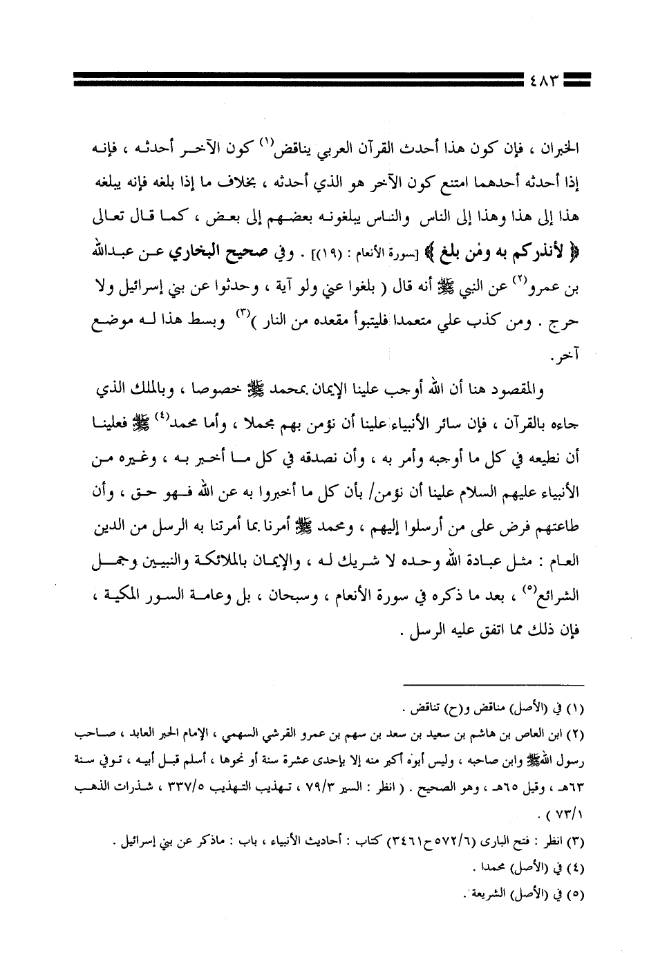 الخبران، فإن كون هذا أحدث القرآن العربي يناقض كون الآخر أحدثه، فإنه إذا أحدثه أحدهما امتنع كون الآخر هو الذي أحدثه، بخلاف ما إذا بلغه فإنه يبلغه هذا إلى هذا وهذا إلى الناس والناس يبلغونه بعضهم إلى بعض، كما قال تعالى: {لأنذركم به ومن بلغ} [سورة الأنعام: (19)]. وفي صحيح البخاري عن عبد الله بن عمرو عن النبي صلى الله عليه وسلم أنه قال (بلغوا عني ولو آية، وحدثوا عن بني إسرائيل ولا حرج. ومن كذب علي متعمدًا فليتبوأ مقعده من النار) وبسط هذا له موضع آخر.