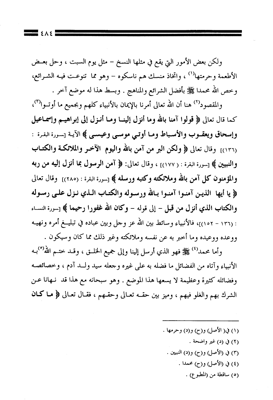 ولكن بعض الأمور التي يقع في مثلها النسخ -مثل يوم السبت، وحل بعض الأطعمة وحرمتها، واتخاذ منسك هم ناسكوه- وهو مما تنوعت فيه الشرائع، وخص الله محمدًا صلى الله عليه وسلم بأفضل الشرائع والمناهج، وبسط هذا له موضع آخر.