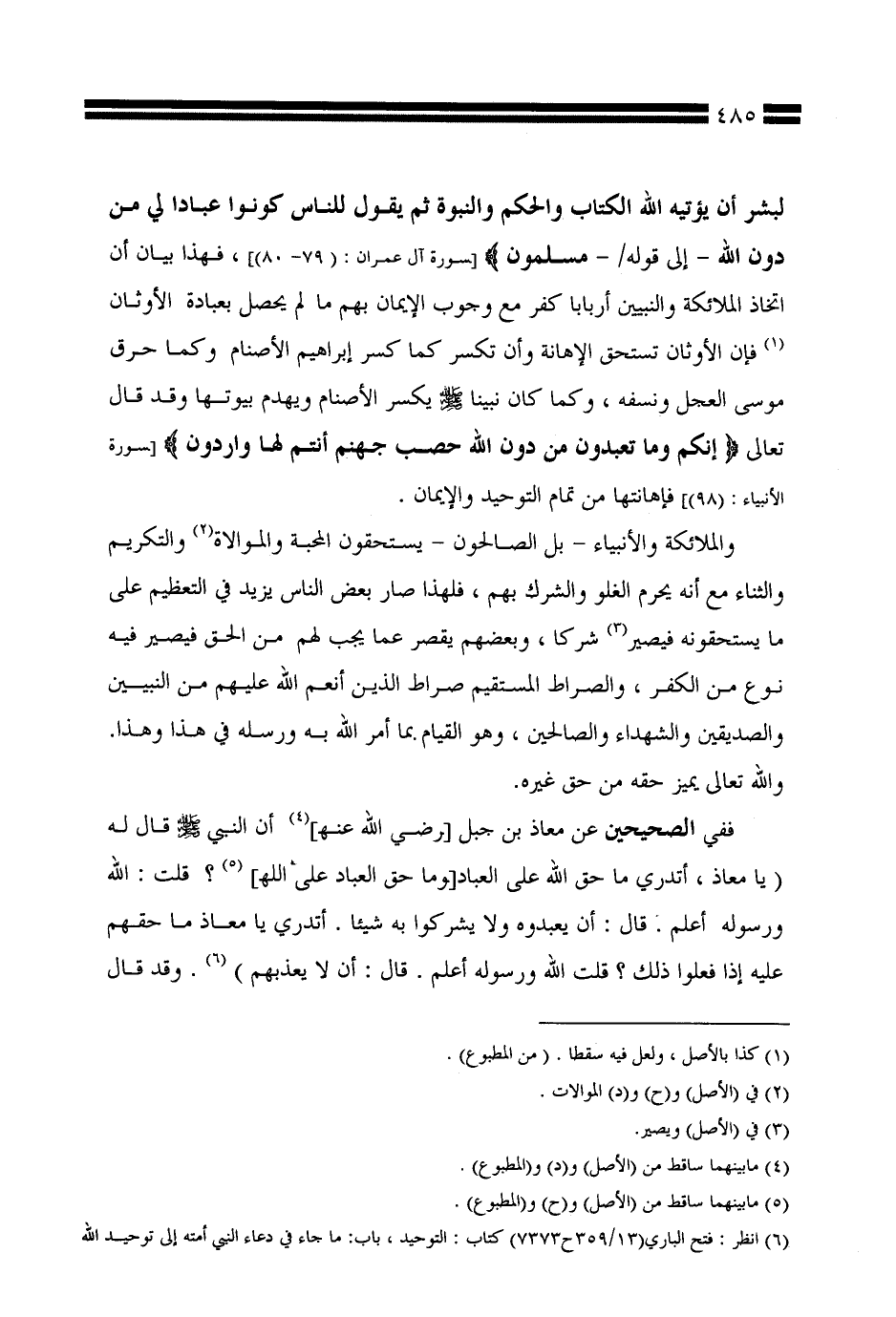 لبشر أن يؤتيه الله الكتاب والحكم والنبوة ثم يقول للناس كونوا عبادًا لي من دون الله -إلى قوله- / مسلمون} [سورة آل عمران: (79 - 80)]، فهذا بيان أن اتخاذ الملائكة والنبيين أربابًا كفر مع وجوب الإيمان بهم، ما لم يحصل بعبادة الأوثان فإن الأوثان تستحق الإهانة وأن تكسر كما كسر إبراهيم الأصنام وكما حرق موسى العجل ونسفه، وكما كان نبينا صلى الله عليه وسلم يكسر الأصنام ويهدم بيوتها وقد قال تعالى: {إنكم وما تعبدون من دون الله حصب جهنم أنتم لها واردون} [سورة الأنبياء: (98)] فإهانتها من تمام التوحيد والإيمان.