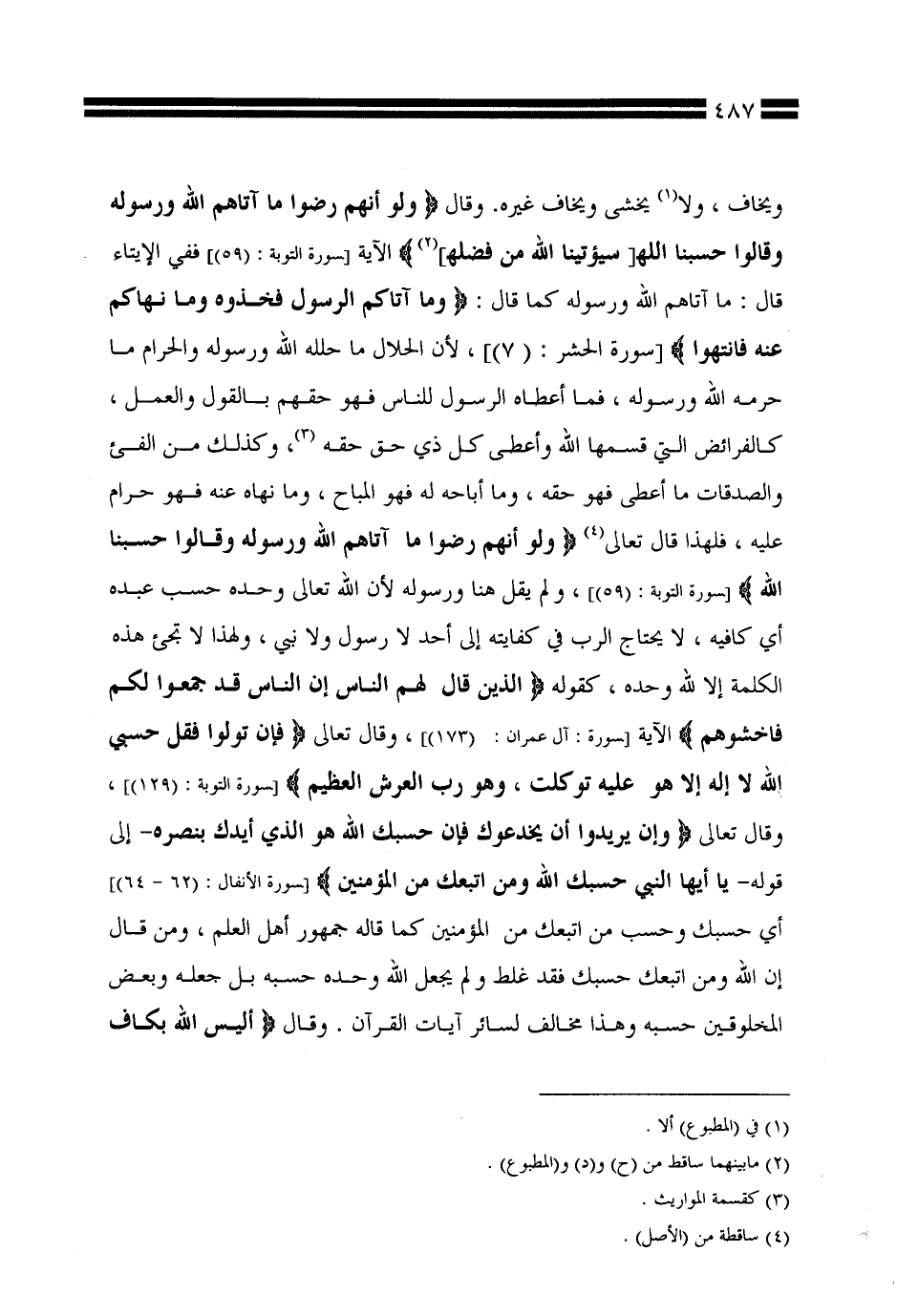 ويخاف، ولا يخشى ويخاف غيره. وقال: {ولو أنهم رضوا ما آتاهم الله ورسوله وقالوا حسبنا الله [سيؤتينا الله من فضله]} الآية [سورة التوبة: (59)] ففي الإيتاء قال: ما آتاهم الله ورسوله كما قال: {وما آتاكم الرسول فخذوه وما نهاكم عنه فانتهوا} [سورة الحشر: (7)]، لأن الحلال ما حلله الله ورسوله والحرام ما حرمه الله ورسوله، فما أعطاه الرسول للناس فهو حقهم بالقول والعمل، كالفرائض التي قسمها الله وأعطى كل ذي حق حقه، وكذلك من الفيء والصدقات ما أعطى فهو حقه، وما أباحه له فهو المباح، وما نهاه عنه فهو حرام عليه، فلهذا قال تعالى {ولو أنهم رضوا ما آتاهم الله ورسوله وقالوا حسبنا الله} [سورة التوبة: (59)]، ولم يقل هنا ورسوله لأن الله تعالى وحده حسب عبده أي كافيه، لا يحتاج الرب في كفايته إلى أحد لا رسول ولا نبي، ولهذا لا تجيء هذه الكلمة إلا لله وحده، كقوله: {الذين قال لهم الناس إن الناس قد جمعوا لكم فاخشوهم} الآية [سورة آل عمران: (173)]، وقال تعالى: {فإن تولوا فقل حسبي الله لا إله إلا هو عليه توكلت، وهو رب العرش العظيم} [سورة التوبة: (129)]، وقال تعالى: {وإن يريدوا أن يخدعوك فإن حسبك الله هو الذي أيدك بنصره -إلى قوله- يا أيها النبي حسبك الله ومن اتبعك من المؤمنين} [سورة الأنفال: (62 - 64)] أي حسبك وحسب من اتبعك من المؤمنين كما قاله جمهور أهل العلم، ومن قال إن الله ومن اتبعك حسبك فقد غلط ولم يجعل الله وحده حسبه بل جعله وبعض المخلوقين حسبه وهذا مخالف لسائر آيات القرآن. وقال: {أليس الله بكاف