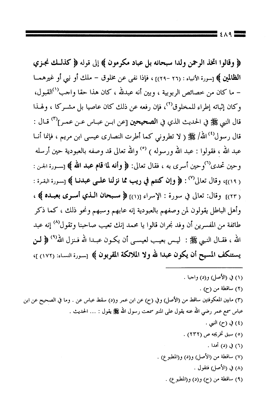 {وقالوا اتخذ الرحمن ولدًا سبحانه بل عباد مكرمون} إلى قوله {كذلك نجزي الظالمين} [سورة الأنبياء: (26 - 29)]، فإذا نفى عن مخلوق -ملك أو نبي أو غيرهما- ما كان من خصائص الربوبية، وبين أنه عبد لله، كان هذا حقًّا واجب القبول، وكان إثباته إطراء للمخلوق، فإن رفعه عن ذلك كان عاصيًا بل مشركًا، ولهذا قال النبي صلى الله عليه وسلم في الحديث الذي في الصحيحين [عن ابن عباس عن عمر] قال: قال رسول الله / صلى الله عليه وسلم (لا تطروني كما أطرت النصارى عيسى ابن مريم، فإنما أنا عبد الله، فقولوا: عبد الله ورسوله) والله تعالى قد وصفه بالعبودية حين أرسله وحين تحدى وحين أسرى به، فقال تعالى: {وأنه لما قام عبد الله} [سورة الجن: (19)]، وقال تعالى: {وإن كنتم في ريب مما نزلنا على عبدنا} [سورة البقرة: (23)]، وقال تعالى في سورة الإسراء [(1)]: {سبحان الذي أسرى بعبده}، وأهل الباطل يقولون لمن وصفهم بالعبودية إنه عابهم وسبهم ونحو ذلك، كما ذكر طائفة من المفسرين أن وفد نجران قالوا: يا محمد إنك تعيب صاحبنا وتقول إنه عبد الله، فقال النبي صلى الله عليه وسلم: (ليس بعيب لعيسى أن يكون عبدًا لله) فنزل الله {لن يستنكف المسيح أن يكون عبدًا لله ولا الملائكة المقربون} [سورة النساء: (172)]،