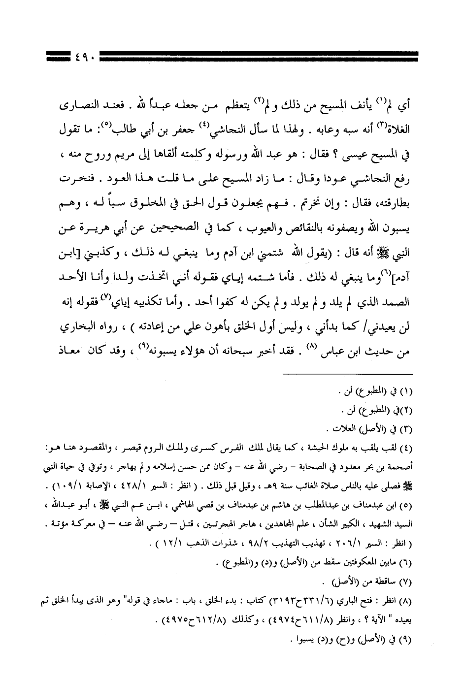 أي لم يأنف المسيح من ذلك ولم يتعظم من جعله عبدًا لله. فعند النصارى الغلاة أنه سبه وعابه. ولهذا لما سأل النجاشي جعفر بن أبي طالب: ما تقول في المسيح عيسى؟ فقال: هو عبد الله ورسوله وكلمته ألقاها إلى مريم وروح منه، رفع النجاشي عودًا وقال: ما زاد المسيح على ما قلت هذا العود. فنخرت بطارقته، فقال: وإن نخرتم. فهم يجعلون قول الحق في المخلوق سبًّا له، وهم يسبون الله ويصفونه بالنقائص والعيوب، كما في الصحيحين عن أبي هريرة عن النبي صلى الله عليه وسلم أنه قال: (يقول الله شتمني ابن آدم وما ينبغي له ذلك، وكذبني [ابن آدم] وما ينبغي له ذلك. فأما شتمه إياي فقوله أني اتخذت ولدًا وأنا الأحد الصمد الذي لم يلد ولم يولد ولم يكن له كفوًا أحد. وأما تكذيبه إياي فقوله إنه لن يعيدني / كما بدأني، وليس أول الخلق بأهون علي من إعادته)، رواه البخاري من حديث ابن عباس. فقد أخبر سبحانه أن هؤلاء يسبونه، وقد كان معاذ