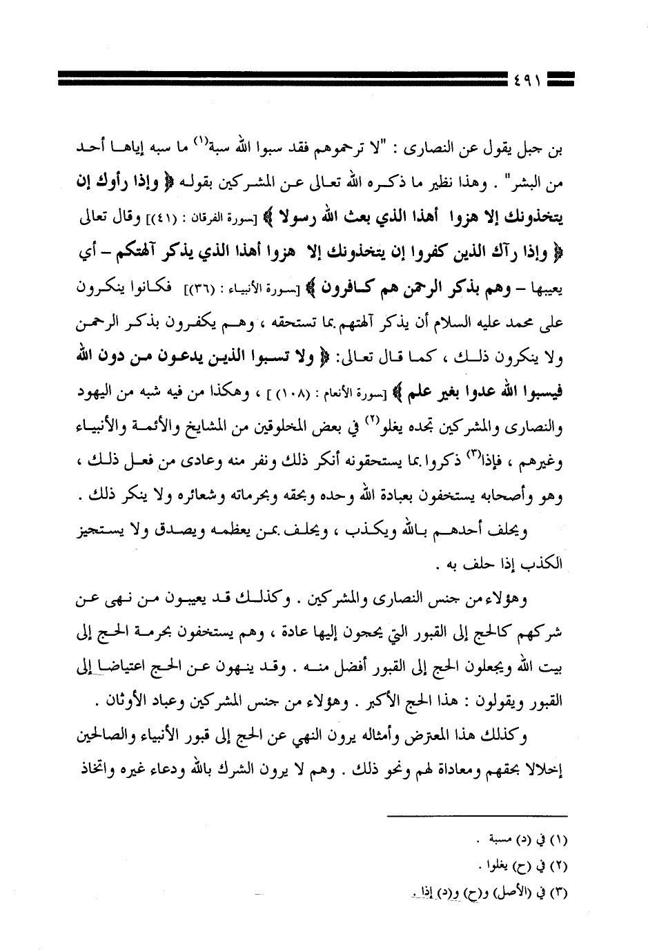 بن جبل يقول عن النصارى: "لا ترحموهم فقد سبوا الله سبة ما سبه إياها أحد من البشر". وهذا نظير ما ذكره الله تعالى عن المشركين بقوله {وإذا رأوك إن يتخذونك إلا هزوًا أهذا الذي بعث الله رسولاً} [سورة الفرقان: (41)]، وقال تعالى: {وإذا رآك الذين كفروا إن يتخذونك إلا هزوًا أهذا الذي يذكر آلهتكم -أي يعيبها- وهم بذكر الرحمن هم كافرون} [سورة الأنبياء: (36)]، فكانوا ينكرون على محمد عليه السلام أن يذكر آلهتهم بما تستحقه، وهم يكفرون بذكر الرحمن ولا ينكرون ذلك، كما قال تعالى: {ولا تسبوا الذين يدعون من دون الله فيسبوا الله عدوًا بغير علم} [سورة الأنعام: (108)]، وهكذا من فيه شبه من اليهود والنصارى والمشركين تجده يغلو في بعض المخلوقين من المشايخ والأئمة والأنبياء وغيرهم، فإذا ذكروا بما يستحقونه أنكر ذلك ونفر منه وعادى من فعل ذلك، وهو وأصحابه يستخفون بعبادة الله وحده وبحقه وبحرماته وشعائره ولا ينكر ذلك.
