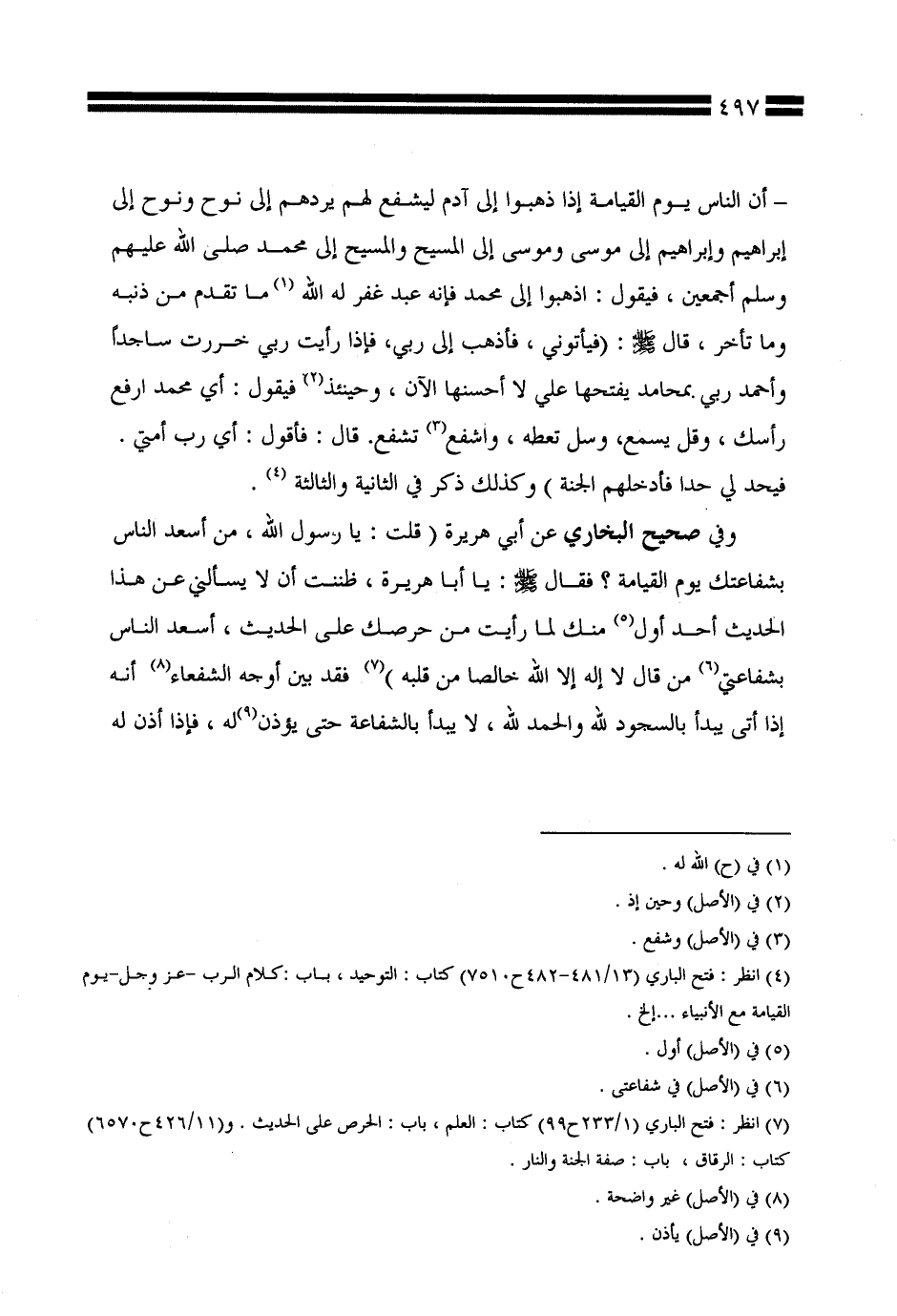 وفي صحيح البخاري عن أبي هريرة (قلت: يا رسول الله، من أسعد الناس بشفاعتك يوم القيامة؟ فقال صلى الله عليه وسلم: يا أبا هريرة، ظننت أن لا يسألني عن هذا الحديث أحد أول منك لما رأيت من حرصك على الحديث، أسعد الناس بشفاعتي من قال لا إله إلا الله خالصًا من قلبه) فقد بين أوجه الشفعاء أنه إذا أتى يبدأ بالسجود والحمد لله، لا يبدأ بالشفاعة حتى يؤذن له، فإذا أذن له