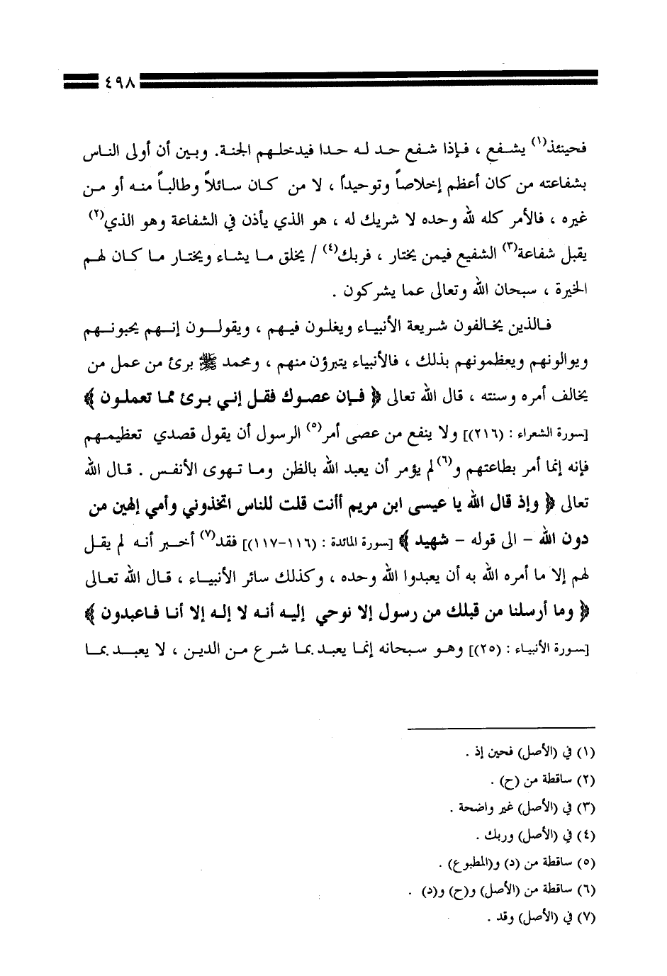فحينئذ يشفع، فإذا شفع حد له حدًّا فيدخلهم الجنة. وبين أن أولى الناس بشفاعته من كان أعظم إخلاصًا وتوحيدًا، لا من كان سائلاً وطالبًا منه أو من غيره، فالأمر كله لله وحده لا شريك له، هو الذي يأذن في الشفاعة وهو الذي يقبل شفاعة الشفيع فيمن يختار، فربك / يخلق ما يشاء ويختار ما كان لهم الخيرة، سبحان الله وتعالى عما يشركون.