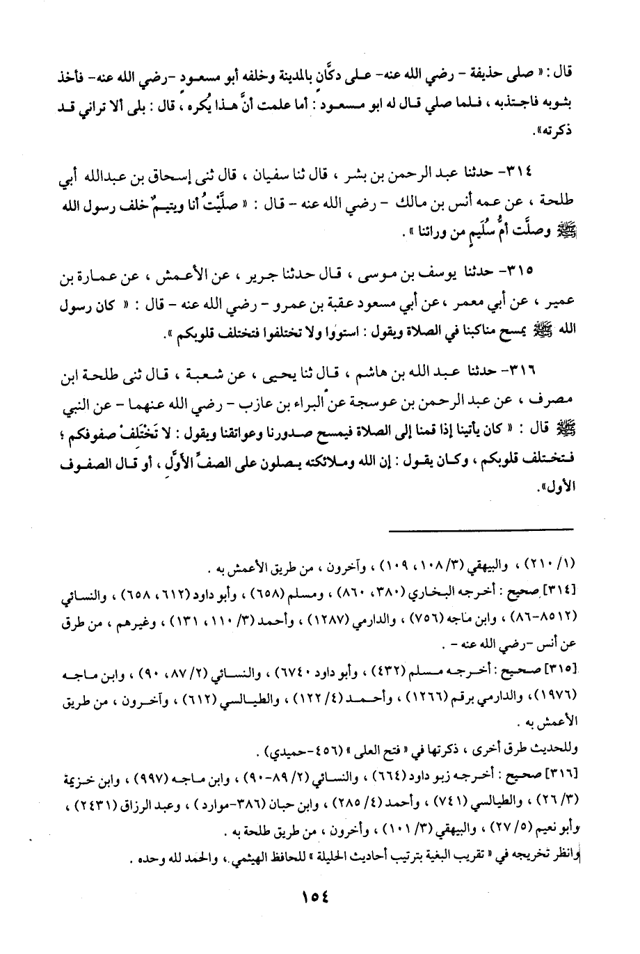 316- حَدَّثَنَا عَبْدُ اللهِ بْنُ هَاشِمٍ ، قَالَ : حَدَّثَنَا يَحْيَى ، عَنْ شُعْبَةَ ، قَالَ : حَدَّثَنِي طَلْحَةُ بْنُ مُصَرِّفٍ عَنْ عَبْدِ الرَّحْمَنِ بْنِ عَوْسَجَةَ ، عَنِ الْبَرَاءِ بْنِ عَازِبٍ ، رَضِيَ اللَّهُ عَنْهُمَا ، عَنِ النَّبِيِّ صَلَّى اللَّهُ عَلَيْهِ وَسَلَّمَ قَالَ : كَانَ يَأْتِينَا إِذَا قُمْنَا إِلَى الصَّلاَةِ فَيَمْسَحُ صُدُورَنَا وَعَوَاتِقَنَا وَيَقُولُ : لاَ تَخْتَلِفُ صُفُوفُكُمْ فَتَخْتَلِفَ قُلُوبُكُمْ ، وَكَانَ يَقُولُ : إِنَّ اللَّهَ وَمَلاَئِكَتَهُ يُصَلُّونَ عَلَى الصَّفِّ الأَوَّلِ أَوْ قَالَ الصُّفُوفِ الأُوَلِ.