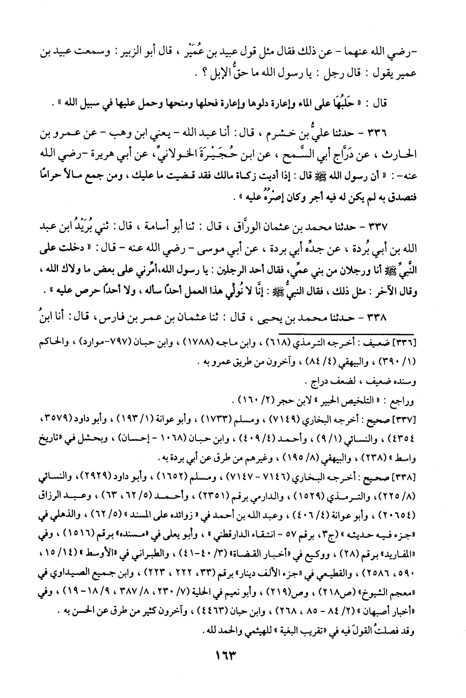 336- حَدَّثَنَا عَلِيُّ بْنُ خَشْرَمٍ ، قَالَ : أَخْبَرَنَا عَبْدُ اللهِ ، يَعْنِي ابْنَ وَهْبٍ ، عَنْ عَمْرِو بْنِ الْحَارِثِ ، عَنْ دَرَّاجٍ أَبِي السَّمْحِ ، عَنِ ابْنِ حُجَيْرَةَ الْخَوْلاَنِيِّ ، عَنْ أَبِي هُرَيْرَةَ ، رَضِيَ اللَّهُ عَنْهُ ، أَنَّ رَسُولَ اللهِ صَلَّى اللَّهُ عَلَيْهِ وَسَلَّمَ قَالَ : إِذَا أَدَّيْتَ زَكَاةَ مَالِكَ فَقَدْ قَضَيْتَ مَا عَلَيْكَ وَمَنْ جَمَعَ مَالاً حَرَامًا فَتَصَدَّقَ بِهِ لَمْ يَكُنْ لَهُ فِيهِ أَجْرٌ وَكَانَ إِصْرُهُ عَلَيْهِ.
