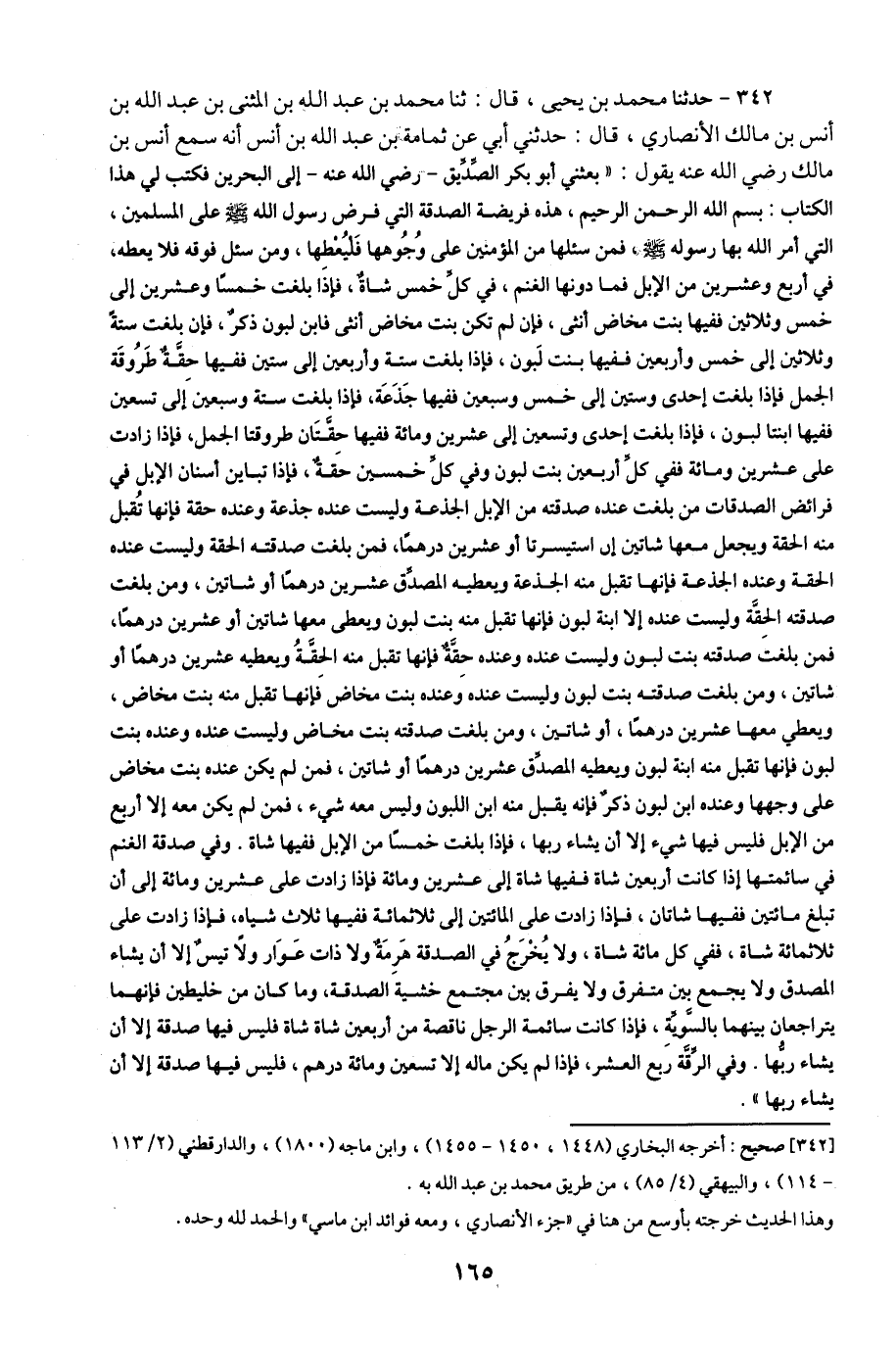 342- حَدَّثَنَا مُحَمَّدُ بْنُ يَحْيَى ، قَالَ : حَدَّثَنَا مُحَمَّدُ بْنُ عَبْدِ اللهِ بْنِ الْمُثَنَّى بْنِ عَبْدِ اللهِ بْنِ أَنَسِ بْنِ مَالِكٍ الأَنْصَارِيُّ ، قَالَ : حَدَّثَنِي أَبِي ، عَنْ ثُمَامَةَ بْنِ عَبْدِ اللهِ بْنِ أَنَسٍ ، أَنَّهُ سَمِعَ أَنَسَ بْنَ مَالِكٍ ، رَضِيَ اللَّهُ عَنْهُ ، يَقُولُ : بَعَثَنِي أَبُو بَكْرٍ الصِّدِّيقُ ، رَضِيَ اللَّهُ عَنْهُ ، إِلَى الْبَحْرَيْنِ فَكَتَبَ لِي هَذَا الْكِتَابَ : بِسْمِ اللهِ الرَّحْمَنِ الرَّحِيمِ هَذِهِ فَرِيضَةُ الصَّدَقَةِ الَّتِي فَرَضَ رَسُولُ اللهِ صَلَّى اللَّهُ عَلَيْهِ وَسَلَّمَ عَلَى الْمُسْلِمِينَ الَّتِي أَمَرَ اللَّهُ بِهَا رَسُولَهُ صَلَّى اللَّهُ عَلَيْهِ وَسَلَّمَ فَمَنْ سُئِلَهَا مِنَ الْمُؤْمِنِينَ عَلَى وجُوهِهَا فَلْيُعْطِهَا وَمَنْ سُئِلَ فَوْقَهُ فَلاَ يُعْطِهِ فِي أَرْبَعٍ وَعِشْرِينَ مِنَ الإِبِلِ فَمَا دُونَهَا الْغَنَمُ فِي كُلِّ خَمْسٍ شَاةٌ فَإِذَا بَلَغَتْ خَمْسًا وَعِشْرِينَ إِلَى خَمْسٍ وَثَلاَثِينَ فَفِيهَا بِنْتُ مَخَاضٍ أُنْثَى فَإِنْ لَمْ تَكُنْ بِنْتُ مَخَاضٍ أُنْثَى فَابْنُ لَبُونٍ ذَكَرٌ فَإِنْ بَلَغَتْ سِتَّةً وَثَلاَثِينَ إِلَى خَمْسٍ وَأَرْبَعِينَ فَفِيهَا بِنْتُ لَبُونٍ فَإِذَا بَلَغَتْ سِتَّةً وَأَرْبَعِينَ إِلَى سِتِّينَ فَفِيهَا حَقَّةٌ طَرُوقَةُ الْجَمَلِ فَإِذَا بَلَغَتْ إِحْدَى وَسِتِّينَ إِلَى خَمْسٍ وَسَبْعِينَ فَفِيهَا جَذَعَةٌ ، فَإِذَا بَلَغَتْ سِتَّةً وَسَبْعِينَ إِلَى تِسْعِينَ فَفِيهَا ابْنَتَا لَبُونٍ فَإِذَا بَلَغَتْ إِحْدَى وَتِسْعِينَ إِلَى عِشْرِينَ وَمِئَةٍ فَفِيهَا حِقَّتَانِ طَرُوقَتَا الْجَمَلِ فَإِذَا زَادَتْ عَلَى عِشْرِينَ وَمِئَةٍ فَفِي كُلِّ أَرْبَعِينَ بِنْتُ لَبُونٍ وَفِي كُلِّ خَمْسِينَ حِقَّةٌ فَإِذَا تَبَايَنَ أَسْنَانُ الإِبِلِ فِي فَرَائِضِ الصَّدَقَاتِ مَنْ بَلَغَتْ عِنْدَهُ صَدَقَتُهُ مِنَ الإِبِلِ الْجَذَعَةَ وَلَيْسَتْ عِنْدَهُ جَذَعَةٌ وَعِنْدَهُ حِقَّةٌ فَإِنَّهَا تُقْبَلُ مِنْهُ الْحِقَّةُ وَيُجْعَلُ مَعَهَا شَاتَيْنِ إِنِ اسْتَيْسَرَتَا أَوْ عِشْرِينَ دِرْهَمًا فَمَنْ بَلَغَتْ صَدَقَتُهُ الْحِقَّةَ وَلَيْسَتْ عِنْدَهُ الْحِقَّةُ وَعِنْدَهُ الْجَذَعَةُ فَإِنَّهَا تُقْبَلُ مِنْهُ الْجَذَعَةُ وَيُعْطِيهِ الْمُصَدِّقُ عِشْرِينَ دِرْهَمًا أَوْ شَاتَيْنِ ، وَمَنْ بَلَغَتْ صَدَقَتُهُ الْحِقَّةَ وَلَيْسَتْ عِنْدَهُ إِلاَّ ابْنَةُ لَبُونٍ فَإِنَّهَا تُقْبَلُ مِنْهُ بِنْتُ لَبُونٍ وَيُعْطِي مَعَهَا شَاتَيْنِ أَوْ عِشْرِينَ دِرْهَمًا فَمَنْ بَلَغَتْ صَدَقَتُهُ بِنْتَ لَبُونٍ وَلَيْسَتْ عِنْدَهُ وَعِنْدَهُ حِقَّةٌ فَإِنَّهَا تُقْبَلُ مِنْهُ الْحِقَّةُ وَيُعْطِيهِ الْمُصَدِّقُ عِشْرِينَ دِرْهَمًا أَوْ شَاتَيْنِ وَمَنْ بَلَغَتْ صَدَقَتُهُ بِنْتَ لَبُونٍ وَلَيْسَتْ عِنْدَهُ وَعِنْدَهُ بِنْتُ مَخَاضٍ فَإِنَّهَا تُقْبَلُ مِنْهُ بِنْتُ مَخَاضٍ وَيُعْطِي مَعَهَا عِشْرِينَ دِرْهَمًا أَوْ شَاتَيْنِ وَمَنْ بَلَغَتْ صَدَقَتُهُ بِنْتَ مَخَاضٍ وَلَيْسَتْ عِنْدَهُ وَعِنْدَهُ بِنْتُ لَبُونٍ فَإِنَّهَا تُقْبَلُ مِنْهُ ابْنَةُ لَبُونٍ وَيُعْطِيهِ الْمُصَدِّقُ عِشْرِينَ دِرْهَمًا أَوْ شَاتَيْنِ فَمَنْ لَمْ يَكُنْ عِنْدَهُ بِنْتُ مَخَاضٍ عَلَى وَجْهِهَا وَعِنْدَهُ ابْنُ لَبُونٍ ذَكَرٌ فَإِنَّهُ يَقْبَلُ مِنْهُ ابْنُ اللَّبُونِ وَلَيْسَ مَعَهُ شَيْءٌ فَمَنْ لَمْ يَكُنْ مَعَهُ إِلاَّ أَرْبَعٌ مِنَ الإِبِلِ فَلَيْسَ فِيهَا شَيْءٌ إِلاَّ أَنْ يَشَاءَ رَبُّهَا فَإِذَا بَلَغَتْ خَمْسًا مِنَ الإِبِلِ فَفِيهَا شَاةٌ وَفِي صَدَقَةِ الْغَنَمِ فِي سَائِمَتِهَا إِذَا كَانَتْ أَرْبَعِينَ شَاةً فَفِيهَا شَاةٌ إِلَى عِشْرِينَ وَمِئَةٍ فَإِذَا زَ