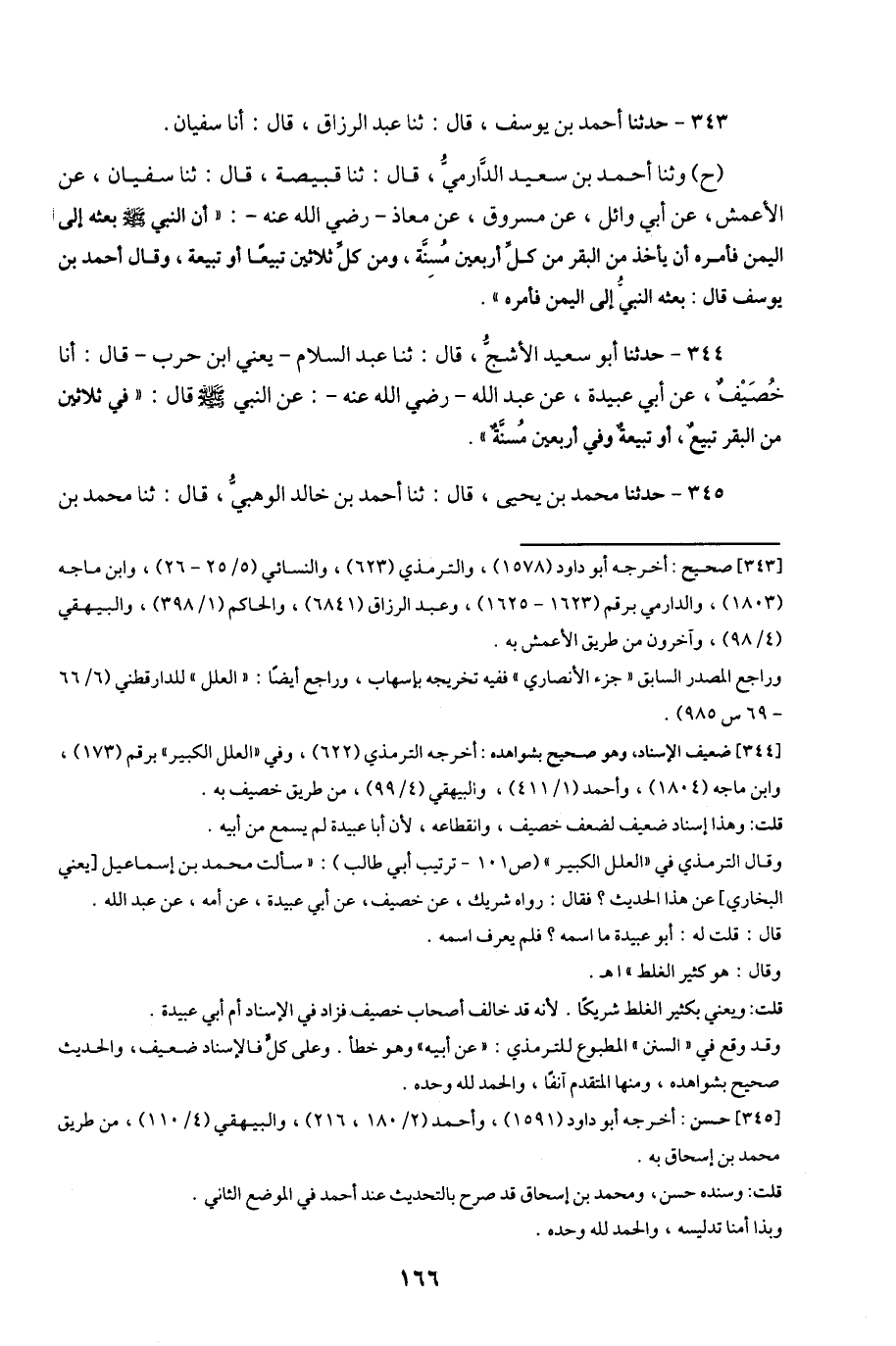 344- حَدَّثَنَا أَبُو سَعِيدٍ الأَشَجُّ ، قَالَ : حَدَّثَنَا عَبْدُ السَّلاَمِ ، يَعْنِي ابْنَ حَرْبٍ ، قَالَ : أَخْبَرَنَا خُصَيْفٌ ، عَنْ أَبِي عُبَيْدَةَ ، عَنْ عَبْدِ اللهِ ، رَضِيَ اللَّهُ عَنْهُ ، عَنِ النَّبِيِّ صَلَّى اللَّهُ عَلَيْهِ وَسَلَّمَ قَالَ : فِي ثَلاَثِينَ مِنَ الْبَقَرِ تَبِيعٌ أَوْ تَبِيعَةٌ وَفِي أَرْبَعِينَ مُسِنَّةٌ.