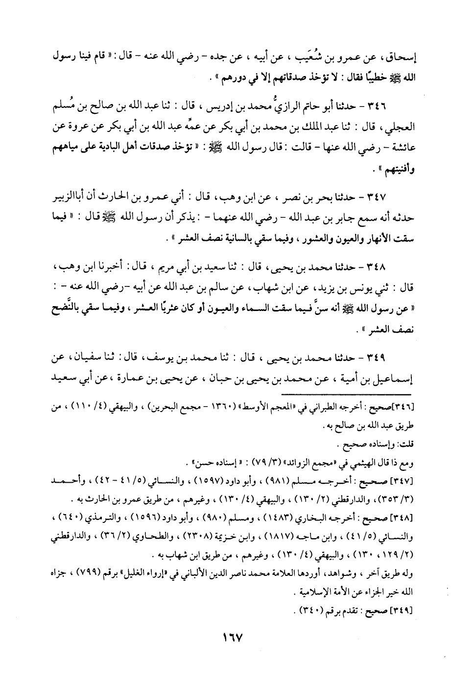 346- حَدَّثَنَا أَبُو حَاتِمٍ الرَّازِيُّ مُحَمَّدُ بْنُ إِدْرِيسَ ، قَالَ : حَدَّثَنَا عَبْدُ اللهِ بْنُ صَالِحِ بْنِ مُسْلِمٍ الْعِجْلِيُّ ، قَالَ : حَدَّثَنَا عَبْدُ الْمَلِكِ بْنُ مُحَمَّدِ بْنِ أَبِي بَكْرٍ ، عَنْ عَمِّهِ عَبْدِ اللهِ بْنِ أَبِي بَكْرٍ ، عَنْ عُرْوَةَ ، عَنْ عَائِشَةَ ، رَضِيَ اللَّهُ عَنْهَا ، قَالَتْ : قَالَ رَسُولُ اللهِ صَلَّى اللَّهُ عَلَيْهِ وَسَلَّمَ : تُؤْخَذُ صَدَقَاتُ أَهْلِ الْبَادِيَةِ عَلَى مِيَاهِهِمْ وَأَفْنِيَتِهِمْ.
