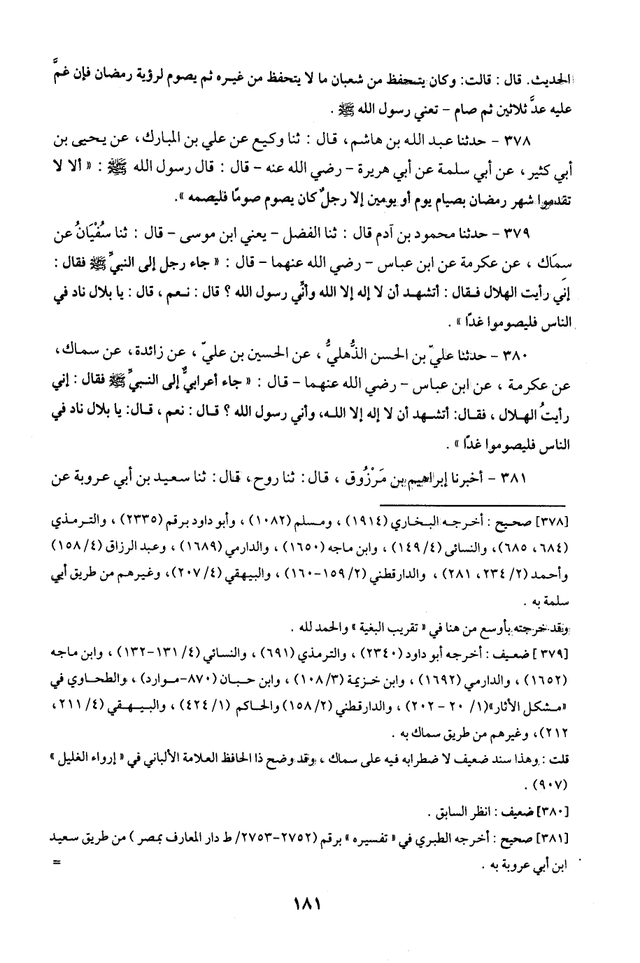 379- حَدَّثَنَا مَحْمُودُ بْنُ آدَمَ ، قَالَ : حَدَّثَنَا الْفَضْلُ ، يَعْنِي ابْنَ مُوسَى ، قَالَ : حَدَّثَنَا سُفْيَانُ ، عَنْ سِمَاكٍ ، عَنْ عِكْرِمَةَ ، عَنِ ابْنِ عَبَّاسٍ ، رَضِيَ اللَّهُ عَنْهُمَا ، قَالَ : جَاءَ رَجُلٌ إِلَى النَّبِيِّ صَلَّى اللَّهُ عَلَيْهِ وَسَلَّمَ فَقَالَ : إِنِّي رَأَيْتُ الْهِلاَلَ فَقَالَ : أَتَشْهَدُ أَنَّ لاَ إِلَهَ إِلاَّ اللَّهُ وَأَنِّي رَسُولُ اللهِ ؟ قَالَ : نَعَمْ ، قَالَ : يَا بِلاَلُ نَادِ فِي النَّاسِ فَلْيَصُومُوا غَدًا.