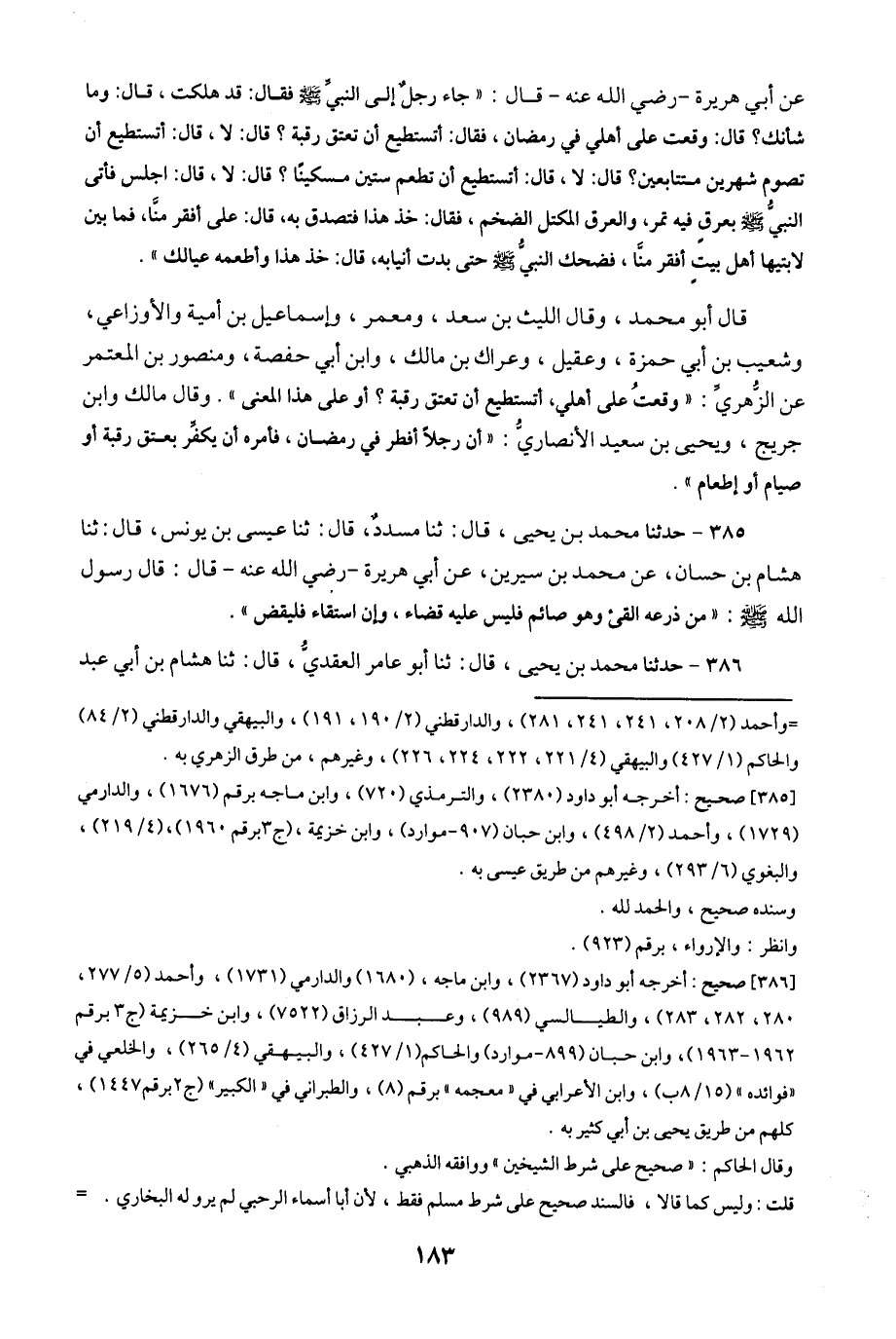 385- حَدَّثَنَا مُحَمَّدُ بْنُ يَحْيَى ، قَالَ : حَدَّثَنَا مُسَدَّدٌ ، قَالَ : حَدَّثَنَا عِيسَى بْنُ يُونُسَ ، قَالَ : حَدَّثَنَا هِشَامُ بْنُ حَسَّانَ ، عَنْ مُحَمَّدِ بْنِ سِيرِينَ ، عَنْ أَبِي هُرَيْرَةَ ، رَضِيَ اللَّهُ عَنْهُ ، قَالَ : قَالَ رَسُولُ اللهِ صَلَّى اللَّهُ عَلَيْهِ وَسَلَّمَ : مَنْ ذَرَعَهُ الْقَيْءُ وَهُوَ صَائِمٌ فَلَيْسَ عَلَيْهِ قَضَاءٌ ، وَإِنْ اسْتَقَاءَ فَلْيَقْضِ.
