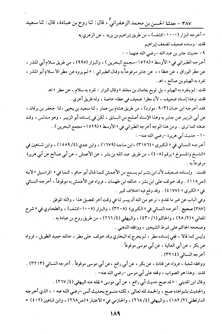387- حَدَّثَنَا الْحَسَنُ بْنُ مُحَمَّدٍ الزَّعْفَرَانِيُّ ، قَالَ : حَدَّثَنَا رَوْحُ بْنُ عُبَادَةَ ، قَالَ : حَدَّثَنَا سَعِيدٌ ، عَنْ مَطَرٍ الْوَرَّاقِ ، عَنْ بَكْرِ بْنِ عَبْدِ اللهِ الْمُزَنِيِّ ، عَنْ أَبِي رَافِعٍ ، قَالَ : دَخَلْتُ عَلَى أَبِي مُوسَى وَهُوَ يَحْتَجِمُ لَيْلاً فَقُلْتُ : لَوْلاَ كَانَ هَذَا نَهَارًا فَقَالَ : أَتَأْمُرُنِي أَنْ أُهَرِيقَ دَمِي وَأَنَا صَائِمٌ وَقَدْ سَمِعْتُ رَسُولَ اللهِ صَلَّى اللَّهُ عَلَيْهِ وَسَلَّمَ يَقُولُ : أَفْطَرَ الْحَاجِمُ وَالْمَحْجُومُ.