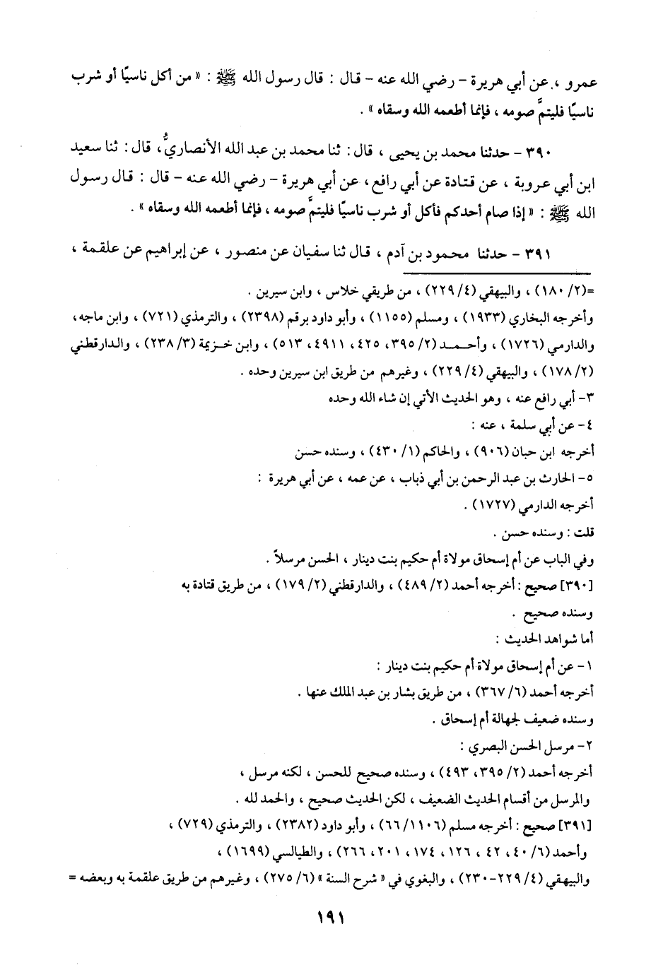 390- حَدَّثَنَا مُحَمَّدُ بْنُ يَحْيَى ، قَالَ : حَدَّثَنَا مُحَمَّدُ بْنُ عَبْدِ اللهِ الأَنْصَارِيُّ ، قَالَ : حَدَّثَنَا سَعِيدُ بْنُ أَبِي عَرُوبَةَ ، عَنْ قَتَادَةَ ، عَنْ أَبِي رَافِعٍ ، عَنْ أَبِي هُرَيْرَةَ ، رَضِيَ اللَّهُ عَنْهُ ، قَالَ : قَالَ رَسُولُ اللهِ صَلَّى اللَّهُ عَلَيْهِ وَسَلَّمَ : إِذَا صَامَ أَحَدُكُمْ فَأَكَلَ أَوْ شَرِبَ نَاسِيًا فَلْيُتِمَّ صَوْمَهُ فَإِنَّمَا أَطْعَمَهُ اللَّهُ وَسَقَاهُ.