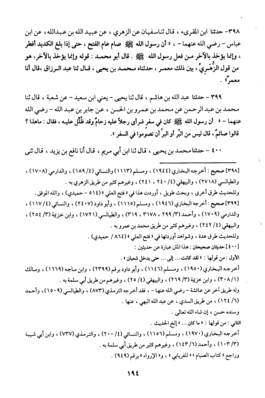 398- حَدَّثَنَا ابْنُ الْمُقْرِئِ ، قَالَ : حَدَّثَنَا سُفْيَانُ ، عَنِ الزُّهْرِيِّ ، عَنْ عُبَيْدِ اللهِ بْنِ عَبْدِ اللهِ ، عَنِ ابْنِ عَبَّاسٍ ، رَضِيَ اللَّهُ عَنْهُمَا أَنَّ رَسُولَ اللهِ صَلَّى اللَّهُ عَلَيْهِ وَسَلَّمَ صَامَ عَامَ الْفَتْحِ حَتَّى إِذَا بَلَغَ الْكَدِيدَ أَفْطَرَ وَإِنَّمَا يُؤْخَذُ بِالآخِرِ مِنْ فِعْلِ رَسُولِ اللهِ صَلَّى اللَّهُ عَلَيْهِ وَسَلَّمَ ، قَالَ أَبُو مُحَمَّدٍ : قَوْلُهُ : وَإِنَّمَا يُؤْخَذُ بِالآخِرِ هُوَ مِنْ قَوْلِ الزُّهْرِيِّ بَيَّنَ ذَلِكَ مَعْمَرٌ ، حَدَّثَنَاهُ مُحَمَّدُ بْنُ يَحْيَى ، قَالَ : حَدَّثَنَا عَبْدُ الرَّزَّاقِ ، قَالَ : أَخْبَرَنَا مَعْمَرٌ.