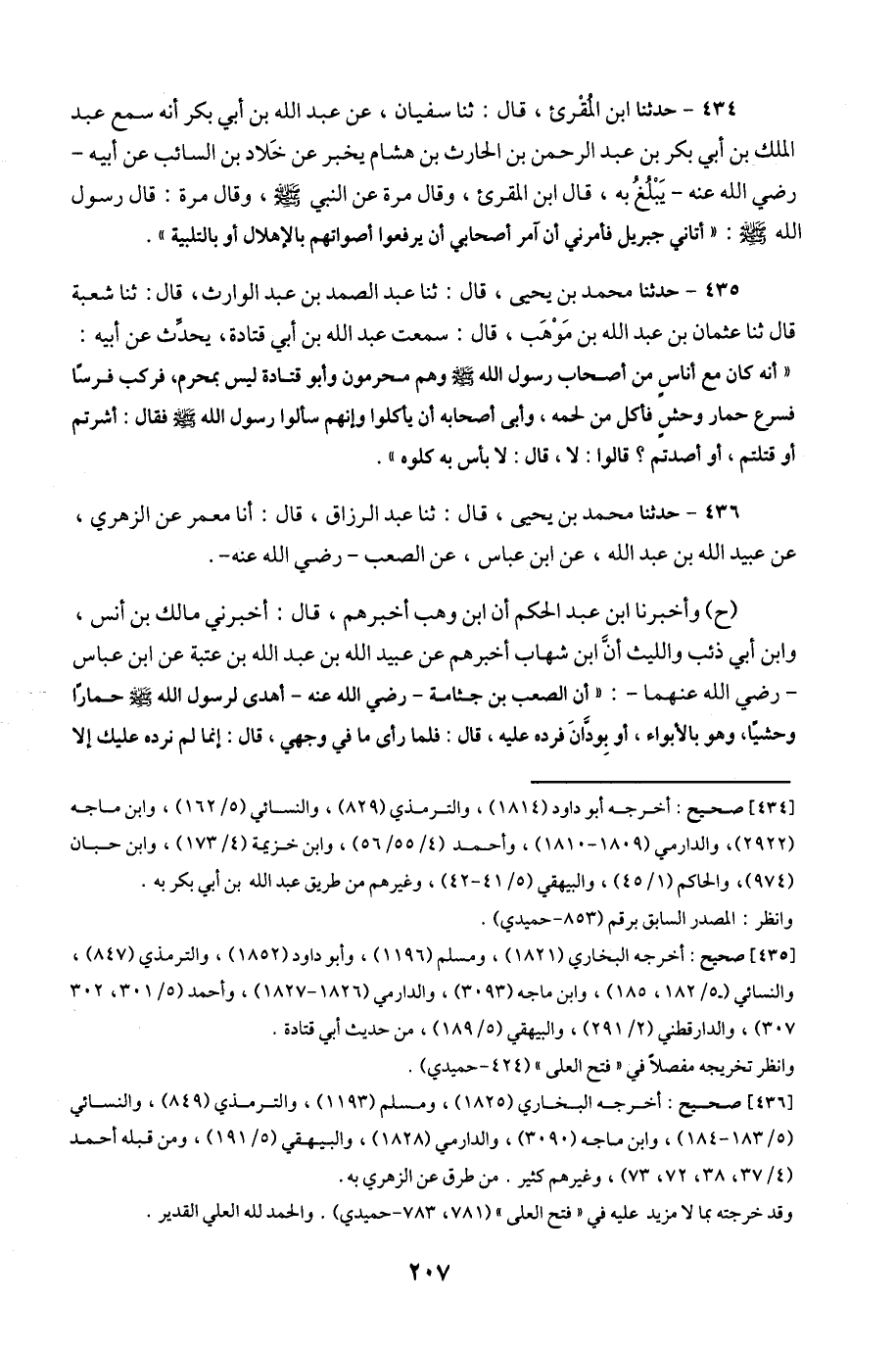 436- حَدَّثَنَا مُحَمَّدُ بْنُ يَحْيَى ، قَالَ : حَدَّثَنَا عَبْدُ الرَّزَّاقِ ، قَالَ : أَخْبَرَنَا مَعْمَرٌ ، عَنِ الزُّهْرِيِّ ، عَنْ عُبَيْدِ اللهِ بْنِ عَبْدِ اللهِ ، عَنِ ابْنِ عَبَّاسٍ ، عَنِ الصَّعْبِ ، رَضِيَ اللَّهُ عَنْهُ (ح) وَأَخْبَرَنَا ابْنُ عَبْدِ الْحَكَمِ ، أَنَّ ابْنَ وَهْبٍ ، أَخْبَرَهُمْ ، قَالَ : أَخْبَرَنِي مَالِكُ بْنُ أَنَسٍ ، وَابْنُ أَبِي ذِئْبٍ ، وَاللَّيْثُ ، أَنَّ ابْنَ شِهَابٍ ، أَخْبَرَهُمْ ، عَنْ عُبَيْدِ اللهِ بْنِ عَبْدِ اللهِ بْنِ عُتْبَةَ ، عَنِ ابْنِ عَبَّاسٍ ، رَضِيَ اللَّهُ عَنْهُمَا أَنَّ الصَّعْبَ بْنَ جَثَّامَةَ ، رَضِيَ اللَّهُ عَنْهُ ، أَهْدَى لِرَسُولِ اللهِ صَلَّى اللَّهُ عَلَيْهِ وَسَلَّمَ حِمَارًا وَحْشِيًّا وَهُوَ بِالأَبْوَاءِ أَوْ بِوَدَّانَ فَرَدَّهُ عَلَيْهِ قَالَ فَلَمَّا رَأَى مَا فِي وَجْهِي قَالَ : إِنَّمَا لَمْ نَرُدَّهُ عَلَيْكَ إِلاَّ أَنَّا حُرُمٌ ، وَقَالَ ابْنُ عُيَيْنَةَ فِي هَذَا لَحْمُ حِمَارٍ وَقَالَ سَعِيدُ بْنُ جُبَيْرٍ عَنِ ابْنِ عَبَّاسٍ ، رَضِيَ اللَّهُ عَنْهُمَا عَجُزُ حِمَارٍ.