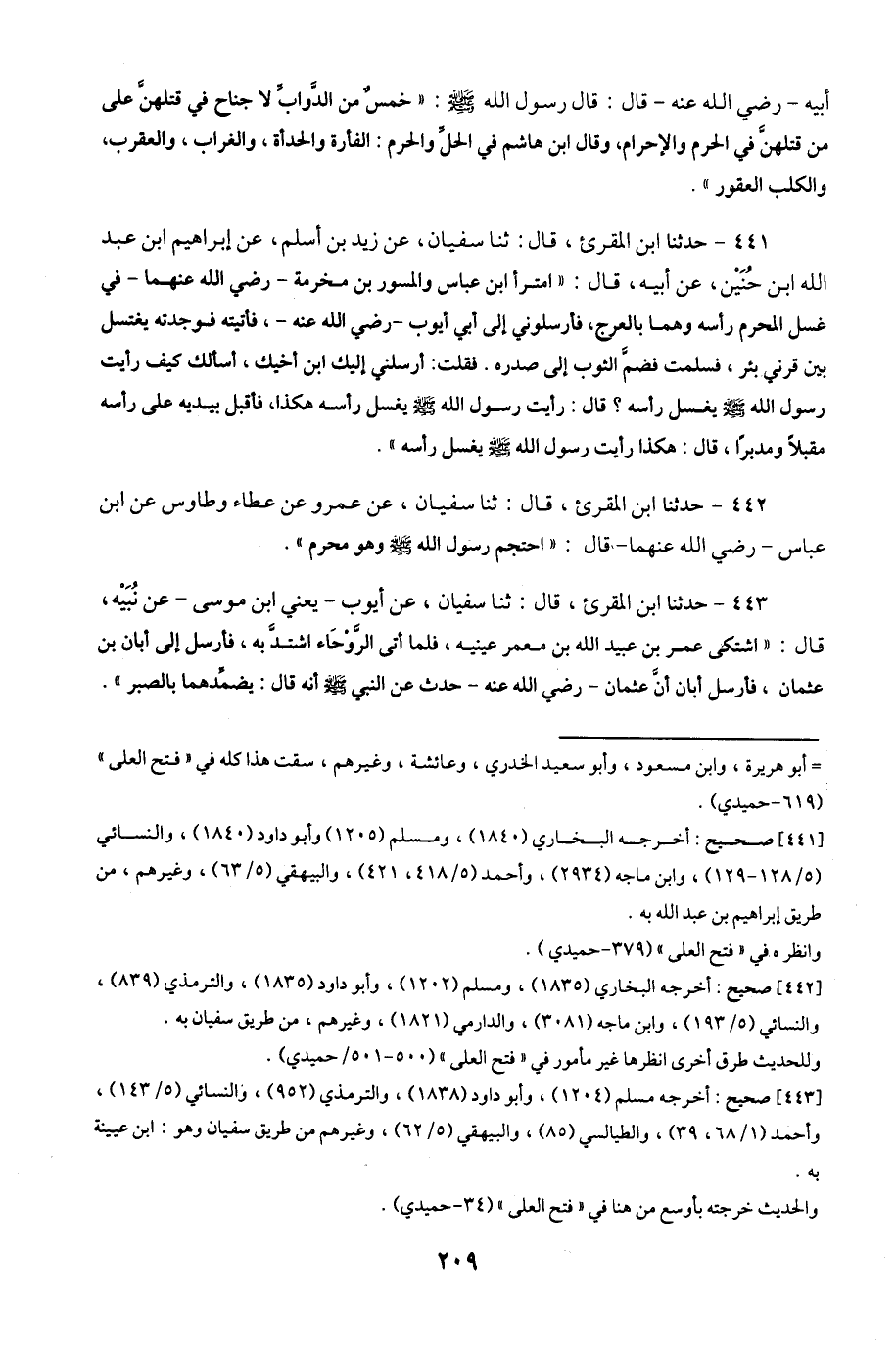 441- حَدَّثَنَا ابْنُ الْمُقْرِئِ ، قَالَ : حَدَّثَنَا سُفْيَانُ ، عَنْ زَيْدِ بْنِ أَسْلَمَ ، عَنْ إِبْرَاهِيمَ بْنِ عَبْدِ اللهِ بْنِ حُنَيْنٍ ، عَنْ أَبِيهِ ، قَالَ : امْتَرَأَ ابْنُ عَبَّاسٍ وَالْمِسْوَرُ بْنُ مَخْرَمَةَ ، رَضِيَ اللَّهُ عَنْهُمَا فِي غُسْلِ الْمُحْرِمِ رَأْسَهُ وَهُمَا بِالْعَرْجِ ، فَأَرْسَلُونِي إِلَى أَبِي أَيُّوبَ ، رَضِيَ اللَّهُ عَنْهُ ، فَأَتَيْتُهُ فَوَجَدْتُهُ يَغْتَسِلُ بَيْنَ قَرْنَيْ بِئْرٍ فَسَلَّمْتُ فَضَمَّ الثَّوْبَ إِلَى صَدْرِهِ فَقُلْتُ : أَرْسَلَنِي إِلَيْكَ ابْنُ أَخِيكَ أَسْأَلُكَ كَيْفَ رَأَيْتَ رَسُولَ اللهِ صَلَّى اللَّهُ عَلَيْهِ وَسَلَّمَ يَغْسِلُ رَأْسَهُ هَكَذَا ؟ فَأَقْبَلَ بِيَدَيْهِ عَلَى رَأْسِهِ مُقْبِلاً وَمُدْبِرًا قَالَ : هَكَذَا رَأَيْتُ رَسُولَ اللهِ صَلَّى اللَّهُ عَلَيْهِ وَسَلَّمَ يَغْسِلُ رَأْسَهُ.