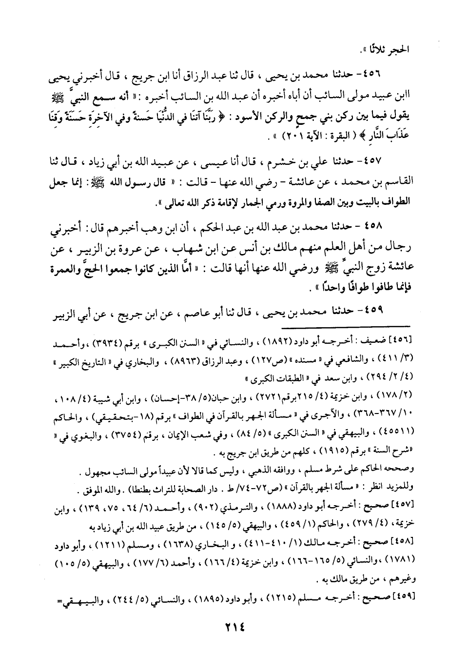 456- حَدَّثَنَا مُحَمَّدُ بْنُ يَحْيَى ، قَالَ : حَدَّثَنَا عَبْدُ الرَّزَّاقِ ، أَخْبَرَنَا ابْنُ جُرَيْجٍ ، قَالَ : أَخْبَرَنِي يَحْيَى بْنُ عُبَيْدٍ ، مَوْلَى السَّائِبِ أَنَّ أَبَاهُ ، أَخْبَرَهُ أَنَّ عَبْدَ اللهِ بْنَ السَّائِبِ أَخْبَرَهُ أَنَّهُ سَمِعَ النَّبِيَّ صَلَّى اللَّهُ عَلَيْهِ وَسَلَّمَ يَقُولُ فِيمَا بَيْنَ رُكْنِ بَنِي جُمَحَ ، وَالرُّكْنِ الأَسْوَدِ : {رَبَّنَا آتِنَا فِي الدُّنْيَا حَسَنَةً وَفِي الإِخِرَةِ حَسَنَةً وَقِنَا عَذَابَ النَّارِ}.