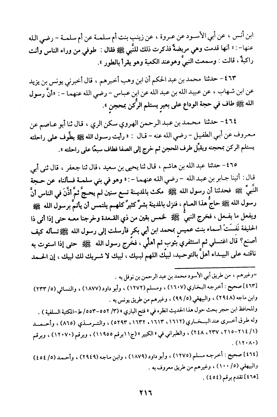 465- حَدَّثَنَا عَبْدُ اللهِ بْنُ هَاشِمٍ ، قَالَ : حَدَّثَنَا يَحْيَى بْنُ سَعِيدٍ ، قَالَ : حَدَّثَنَا جَعْفَرٌ ، قَالَ : حَدَّثَنِي أَبِي قَالَ : أَتَيْنَا جَابِرَ بْنَ عَبْدِ اللهِ ، رَضِيَ اللَّهُ عَنْهُمَا وَهُوَ فِي بَنِي سَلَمَةَ فَسَأَلْنَاهُ عَنْ حَجَّةِ النَّبِيِّ صَلَّى اللَّهُ عَلَيْهِ وَسَلَّمَ فَحَدَّثَنَا أَنَّ رَسُولَ اللهِ صَلَّى اللَّهُ عَلَيْهِ وَسَلَّمَ مَكَثَ بِالْمَدِينَةِ تِسْعَ سِنِينَ لَمْ يَحُجَّ ، ثُمَّ أُذِّنَ فِي النَّاسِ أَنَّ رَسُولَ اللهِ صَلَّى اللَّهُ عَلَيْهِ وَسَلَّمَ حَاجٌّ هَذَا الْعَامَ فَنَزَلَ بِالْمَدِينَةِ بِشَرٌ كَثِيرٌ كُلُّهُمْ يَلْتَمِسُ أَنْ يَأْتَمَّ بِرَسُولِ اللهِ صَلَّى اللَّهُ عَلَيْهِ وَسَلَّمَ وَيَفْعَلَ مَا يَفْعَلُ فَخَرَجَ النَّبِيُّ صَلَّى اللَّهُ عَلَيْهِ وَسَلَّمَ لِخَمْسٍ بَقِينَ مِنْ ذِي الْقَعْدَةِ وَخَرَجْنَا مَعَهُ حَتَّى إِذَا أَتَى ذَا الْحُلَيْفَةِ نَفِسَتْ أَسْمَاءُ بِنْتُ عُمَيْسٍ بِمُحَمَّدِ بْنِ أَبِي بَكْرٍ فَأَرْسَلَتْ إِلَى رَسُولِ اللهِ صَلَّى اللَّهُ عَلَيْهِ وَسَلَّمَ تَسْأَلُهُ كَيْفَ أَصْنَعُ ؟ قَالَ : اغْتَسِلِي ، ثُمَّ اسْتَثْفِرِي بِثَوْبٍ ، ثُمَّ أَهِلِّي ، فَخَرَجَ رَسُولُ اللهِ حَتَّى إِذَا اسْتَوَتْ بِهِ نَاقَتُهُ عَلَى الْبَيْدَاءِ أَهَلَّ بِالتَّوْحِيدِ : لَبَّيْكَ اللَّهُمَّ لَبَّيْكَ لَبَّيْكَ لاَ شَرِيكَ لَكَ لَبَّيْكَ إِنَّ الْحَمْدَ وَالنِّعْمَةَ لَكَ وَالْمُلْكَ لاَ شَرِيكَ لَكَ ، وَلَبَّى النَّاسُ وَالنَّاسُ يَزِيدُونَ ذَا الْمَعَارِجِ وَنَحْوَهُ ، وَالنَّبِيُّ صَلَّى اللَّهُ عَلَيْهِ وَسَلَّمَ يَسْمَعُ فَلاَ يَقُولُ لَهُمْ شَيْئًا فَنَظَرْتُ مَدَّ بَصَرِي بَيْنَ يَدَيْ رَسُولِ اللهِ صَلَّى اللَّهُ عَلَيْهِ وَسَلَّمَ فَمِنْ رَاكِبٍ وَمَاشٍ وَمِنْ خَلْفِهِ مِثْلُ ذَلِكَ وَعَنْ يَمِينِهِ مِثْلُ ذَلِكَ وَعَنْ شِمَالِهِ مِثْلُ ذَلِكَ قَالَ جَابِرٌ : وَرَسُولُ اللهِ صَلَّى اللَّهُ عَلَيْهِ وَسَلَّمَ بَيْنَ أَظْهُرِنَا عَلَيْهِ يَنْزِلُ الْقُرْآنُ وَهُوَ يُعْرَفُ تَأْوِيلَهُ فَمَا عَمِلَ بِهِ مِنْ شَيْءٍ عَمِلْنَا فَخَرَجْنَا لاَ نَنْوِي إِلاَّ الْحَجَّ حَتَّى إِذَا أَتَيْنَا الْكَعْبَةَ اسْتَلَمَ نَبِيُّ اللهِ صَلَّى اللَّهُ عَلَيْهِ وَسَلَّمَ الْحَجَرَ الأَسْوَدَ ، ثُمَّ رَمَلَ ثَلاَثَةً وَمَشَى أَرْبَعَةً حَتَّى إِذَا فَرَغَ عَمَدَ إِلَى مَقَامِ إِبْرَاهِيمَ صَلَّى اللَّهُ عَلَيْهِ وَسَلَّمَ فَصَلَّى خَلْفَهُ رَكْعَتَيْنِ ، ثُمَّ قَرَأَ {وَاتَّخِذُوا مِنْ مَقَامِ إِبْرَاهِيمَ مُصَلَّى} قَالَ أَبِي : فَقَرَأَ فِيهِ بِالتَّوْحِيدِ ، وَقُلْ يَا أَيُّهَا الْكَافِرُونَ ، ثُمَّ اسْتَلَمَ الْحَجَرَ وَخَرَجَ إِلَى الصَّفَا ، ثُمَّ قَرَأَ {إِنَّ الصَّفَا وَالْمَرْوَةَ مِنْ شَعَائِرِ اللَّهِ} ، ثُمَّ قَالَ : نَبْدَأُ بِمَا بَدَأَ اللَّهُ بِهِ فَرَقَيَ عَلَى الصَّفَا حَتَّى إِذَا نَظَرَ إِلَى الْبَيْتِ كَبَّرَ ، ثُمَّ قَالَ : لاَ إِلَهَ إِلاَّ اللَّهُ وَحْدَهُ لاَ شَرِيكَ لَهُ لَهُ الْمُلْكُ وَلَهُ الْحَمْدُ وَهُوَ عَلَى كُلِّ شَيْءٍ قَدِيرٌ لاَ إِلَهَ إِلاَّ اللَّهُ أَنْجَزَ وَعْدَهُ وَنَصَرَ عَبْدَهُ وَهَزَمَ - أَوْ غَلَبَ - الأَحْزَابَ وَحْدَهُ ،