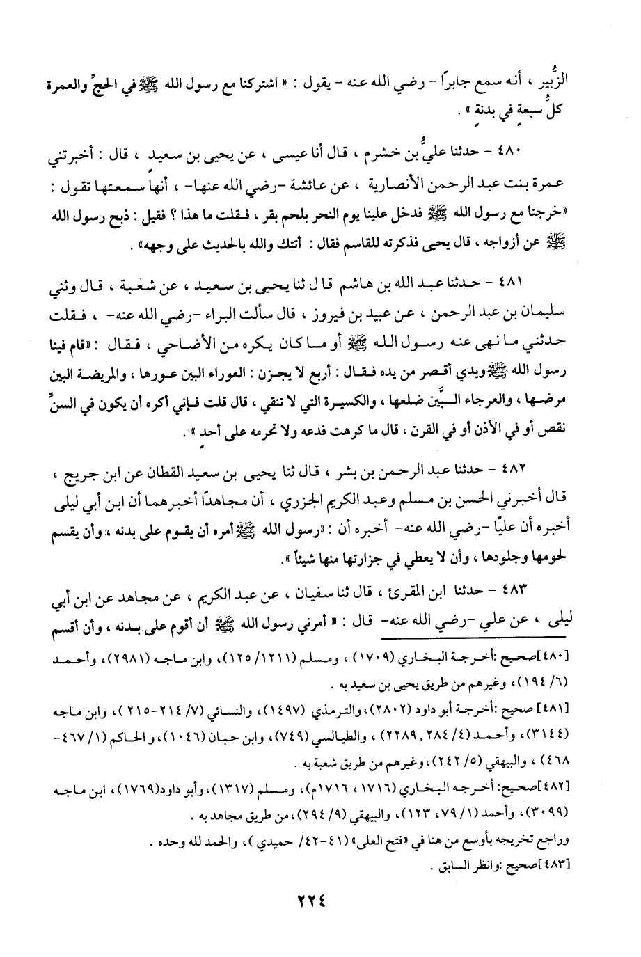 482- حَدَّثَنَا عَبْدُ الرَّحْمَنِ بْنُ بِشْرٍ ، قَالَ : حَدَّثَنَا يَحْيَى بْنُ سَعِيدٍ الْقَطَّانُ ، عَنِ ابْنِ جُرَيْجٍ ، قَالَ : أَخْبَرَنِي الْحَسَنُ بْنُ مُسْلِمٍ ، وَعَبْدُ الْكَرِيمِ الْجَزَرِيُّ ، أَنَّ مُجَاهِدًا ، أَخْبَرَهُمَا ، أَنَّ ابْنَ أَبِي لَيْلَى أَخْبَرَهُ ، أَنَّ عَلِيًّا ، رَضِيَ اللَّهُ عَنْهُ ، أَخْبَرَهُ أَنَّ رَسُولَ اللهِ صَلَّى اللَّهُ عَلَيْهِ وَسَلَّمَ أَمَرَهُ أَنْ يَقُومَ عَلَى بُدْنِهِ وَأَنْ يُقْسِمَ لُحُومَهَا وَجُلُودَهَا وَأَنْ لاَ يُعْطِيَ فِي جِزَارَتِهَا مِنْهَا شَيْئًا.